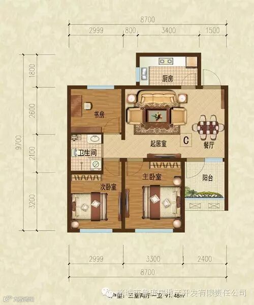 C户型:三室两厅一卫 91.48㎡