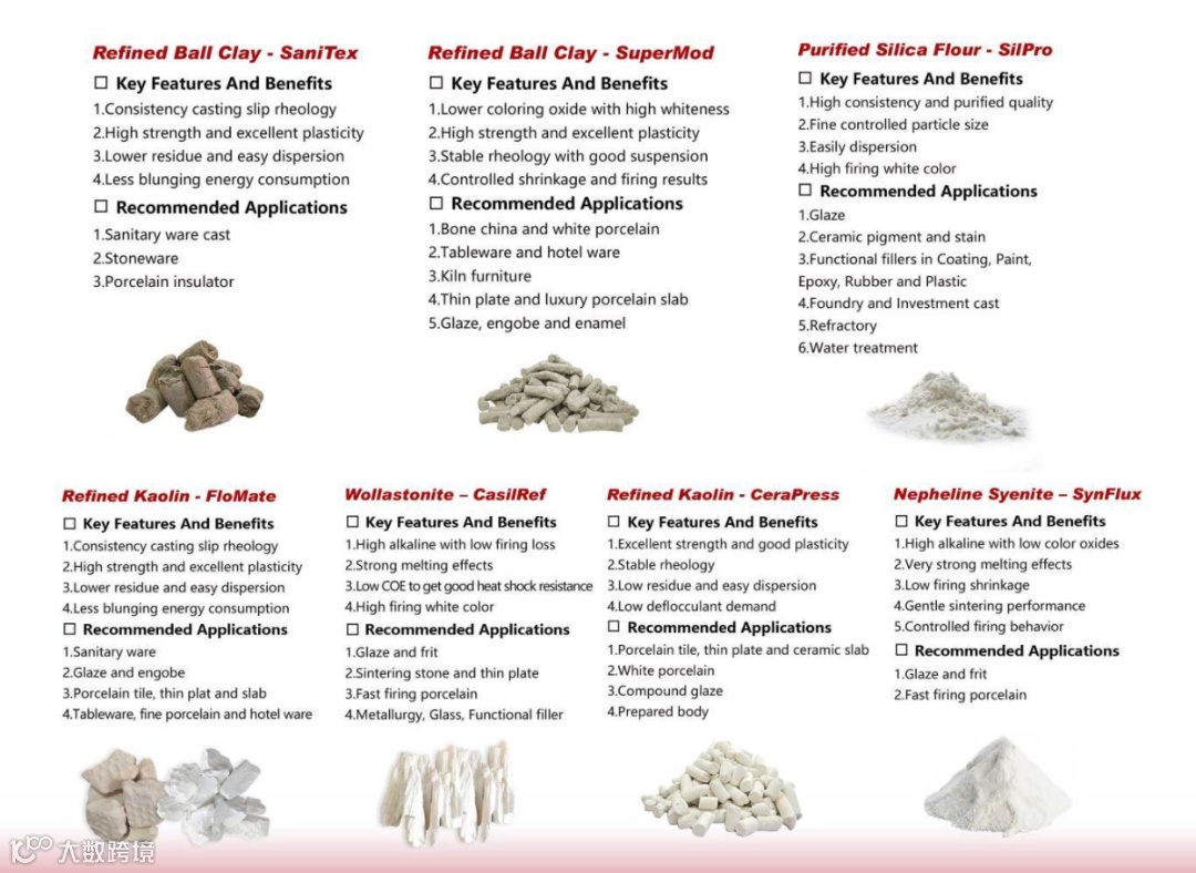 除了拳头产品外,金刚集团建陶原辅料,包括高岭土、球粘土、霞石、硅灰石等系列产品也进行了展示,可为广大客户提供原辅料解决方案。