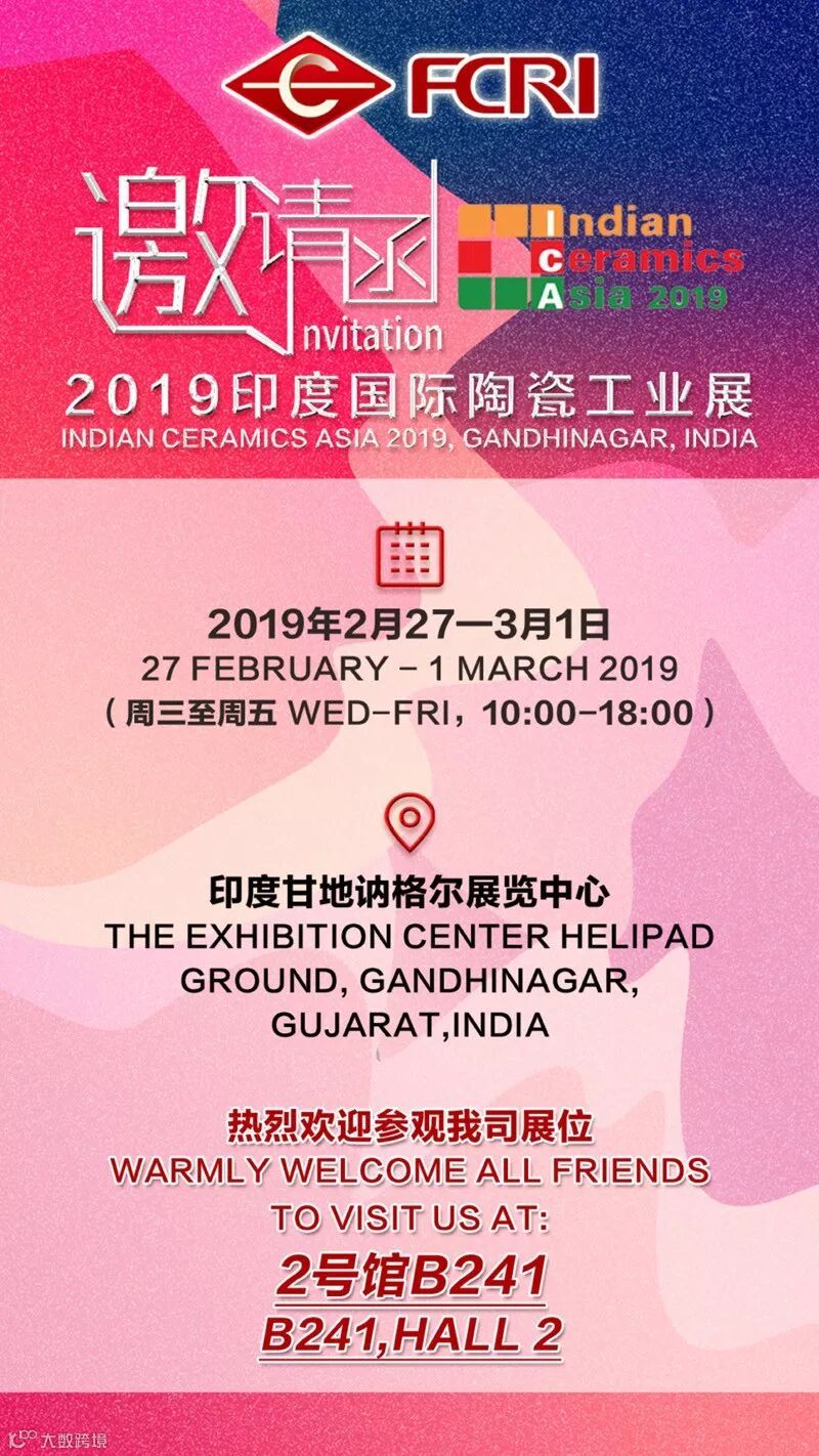 2019年2月27—3月1日,2019印度国际陶瓷工业展将在印度甘地讷格尔展览中心举行,届时金刚集团将在2号馆B241号展位恭候您的光临!