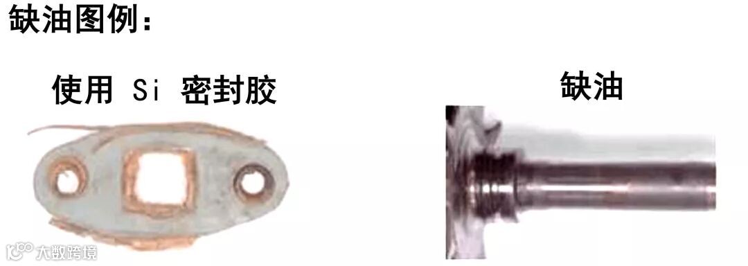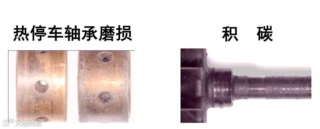 排气温度过高或热停车导致积碳、若在停车之前发动机保持怠速 2 ~ 3 分钟,可改进这一现象,涡端温度渗入中间壳导致机油碳化,以及轴承系统的腐蚀。积碳主要发生在轴密封环,槽间,涡端轴承上以及中间壳泄油孔内。