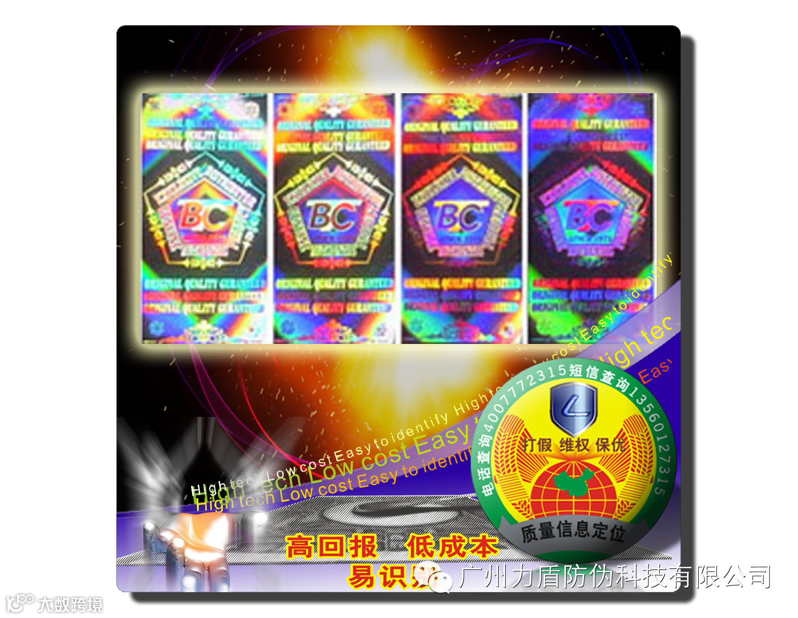 广州力盾防伪科技有限公司 巨资引进国际设备十多年技术经验经营:全息图制品、数码防伪、激光防伪、加密防伪、激光微缩字、解码光刻激光标防伪、激光标打流水号、光刻水洗电化铝防伪、荧光防伪、光学变色防伪、变色龙、温变(摸变)防伪、滴水消失防伪、版纹变字防伪、易碎纸防伪标等。