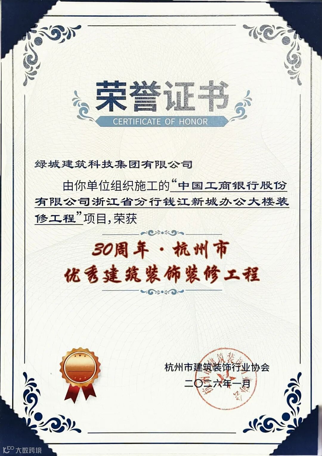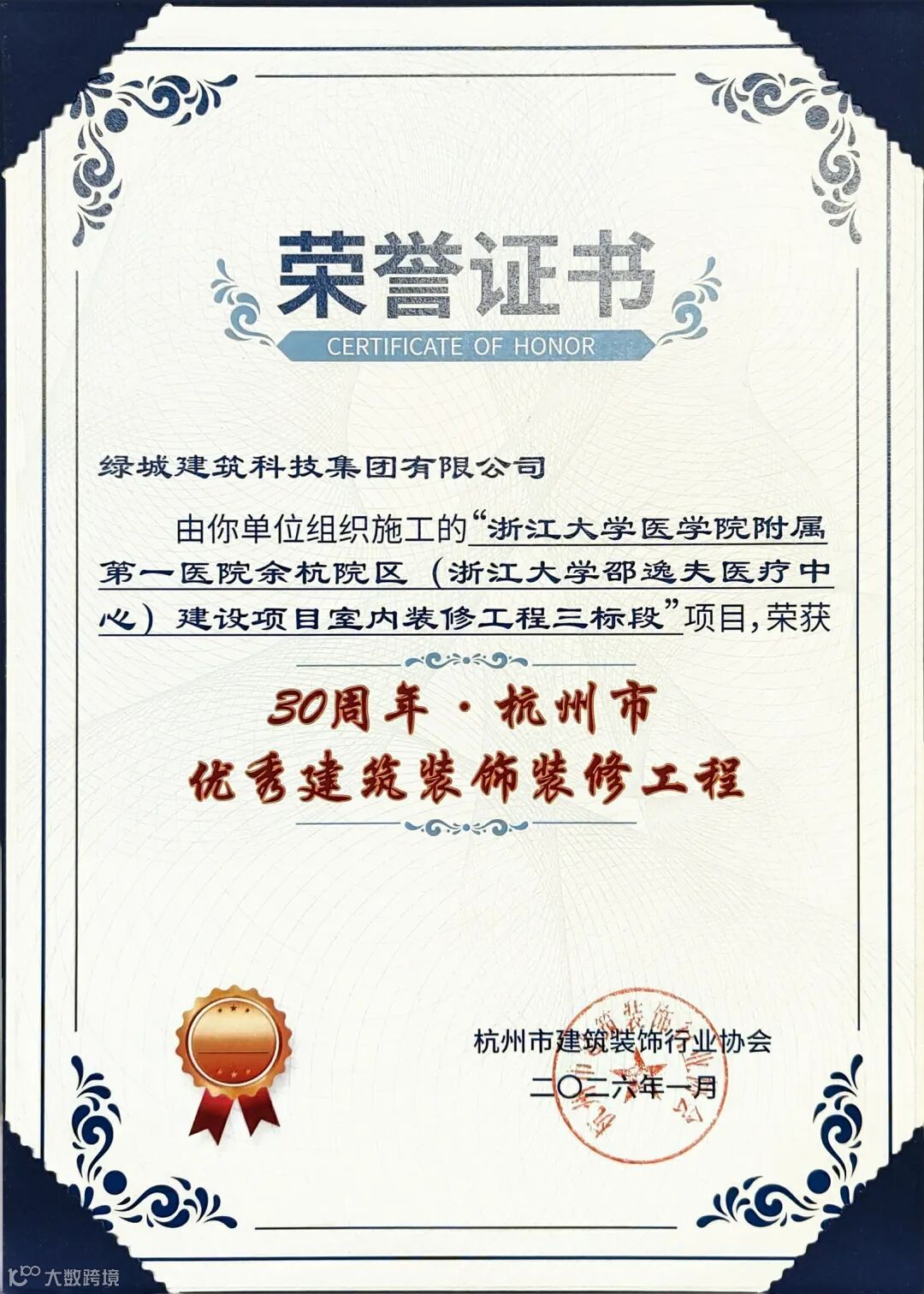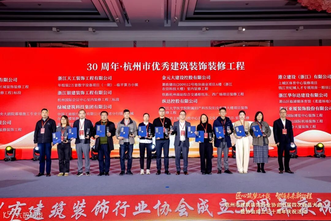 集团承建的浙江大学医学院附属第一医院余杭院区(浙江大学邵逸夫医疗中心)、工商银行浙江省分行钱江新城办公大楼项目,获得30周年“杭州市优秀建筑装饰装修工程”奖项。