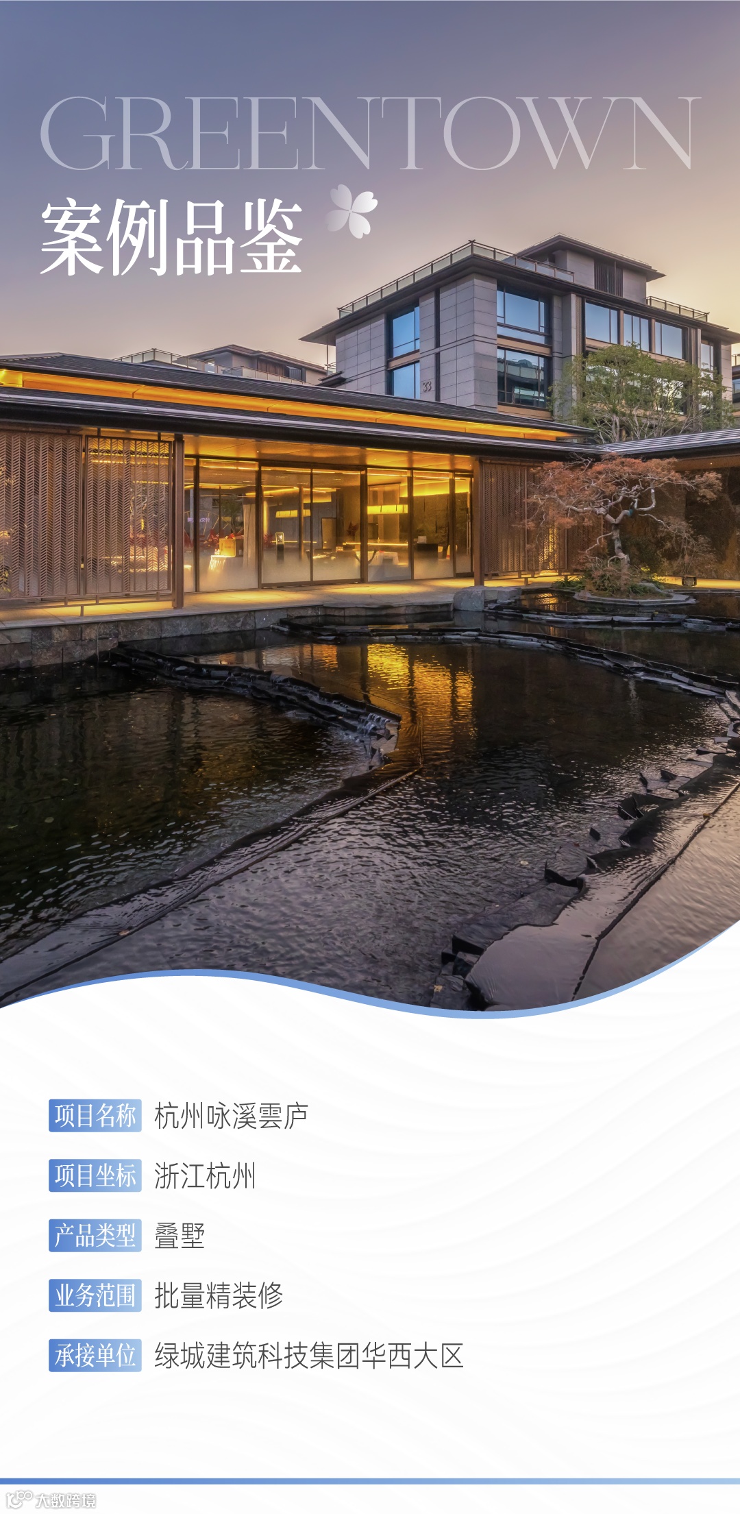 本期案例品鉴——杭州咏溪雲庐,绿城建筑科技集团承接项目112户室内及公区、61户标准层批量精装修,以及 38户地下室个性化精装修工程,总面积超2.8万㎡,将“自得山居,大雅至简”的居住美学,化作可触摸的工艺诗篇。