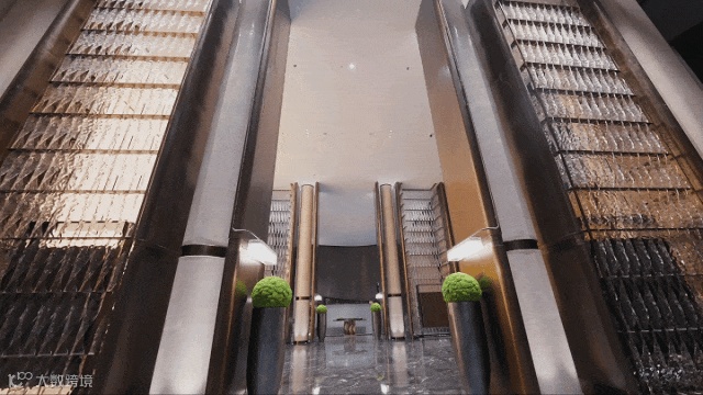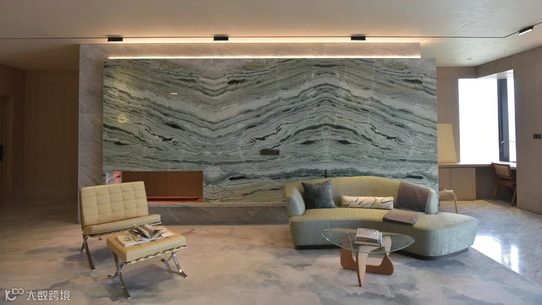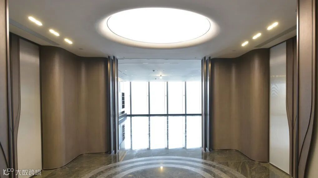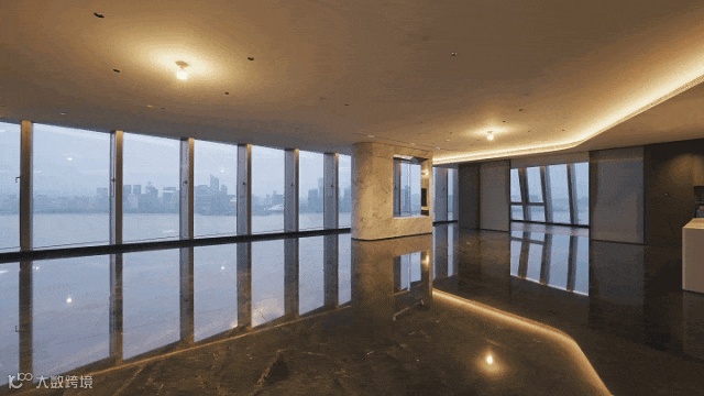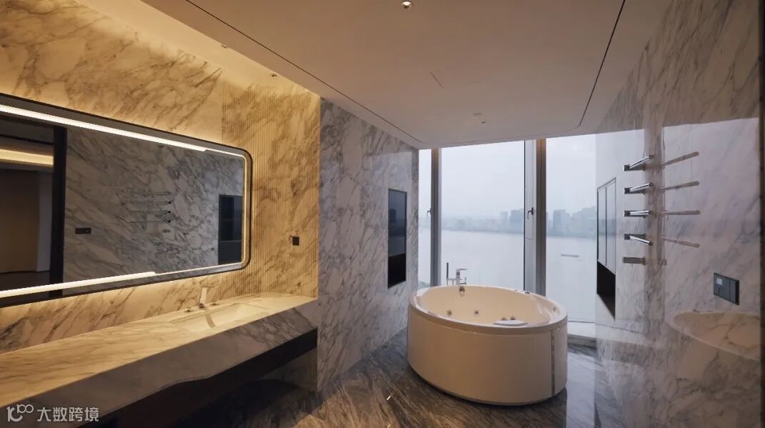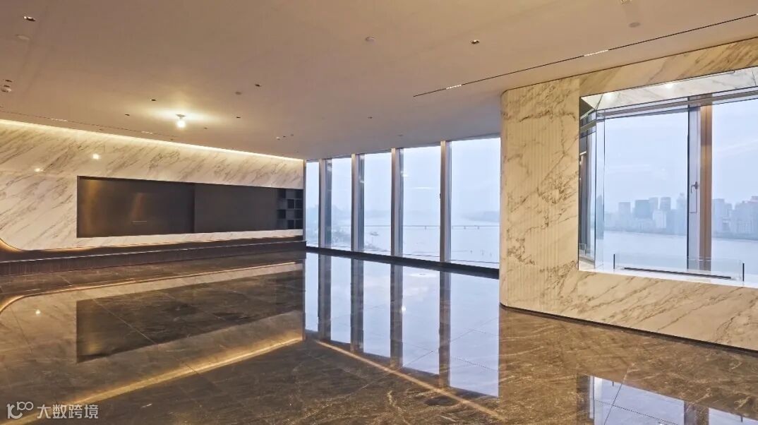 推门而入,通过圆形天花透光膜采光,在巴西山水大理石地面上晕染出层层波浪纹理,与窗外浩荡奔涌的钱江气象互为应和。