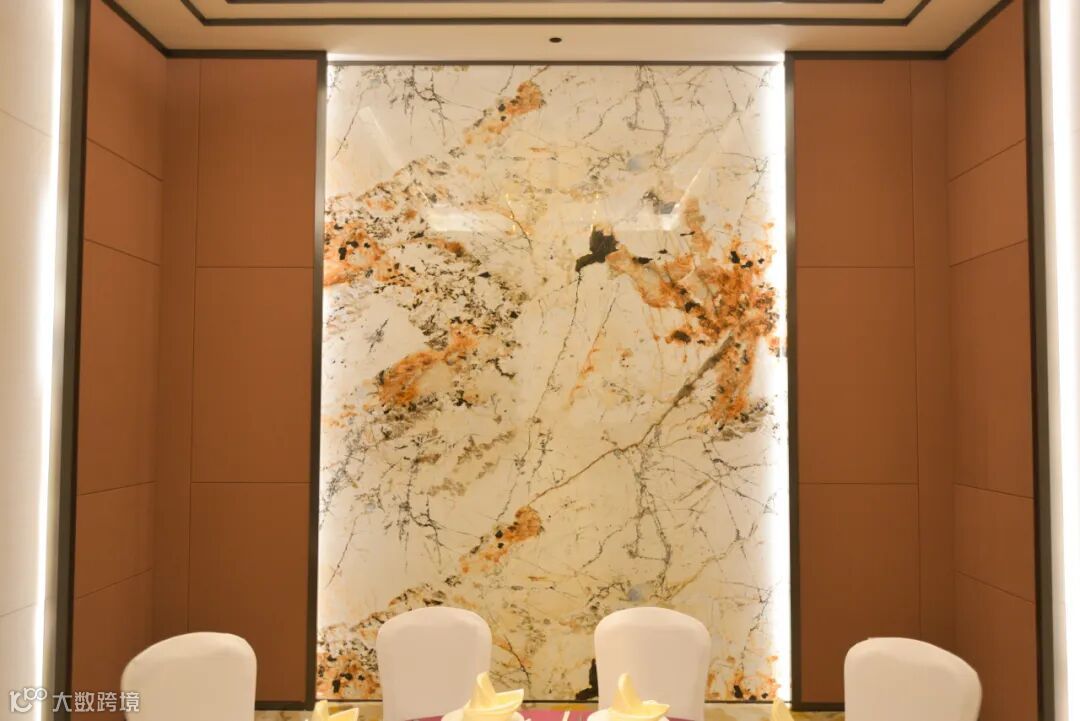 会客厅与餐厅的背景墙则采用了天然岩板,项目团队远赴福建精心挑选优质板材,以严苛标准进行纹理拼接,精确控制墙面的平整度与扭曲度,每一个细节都彰显着对品质的执着追求,为贵宾会见增添了奢华质感。