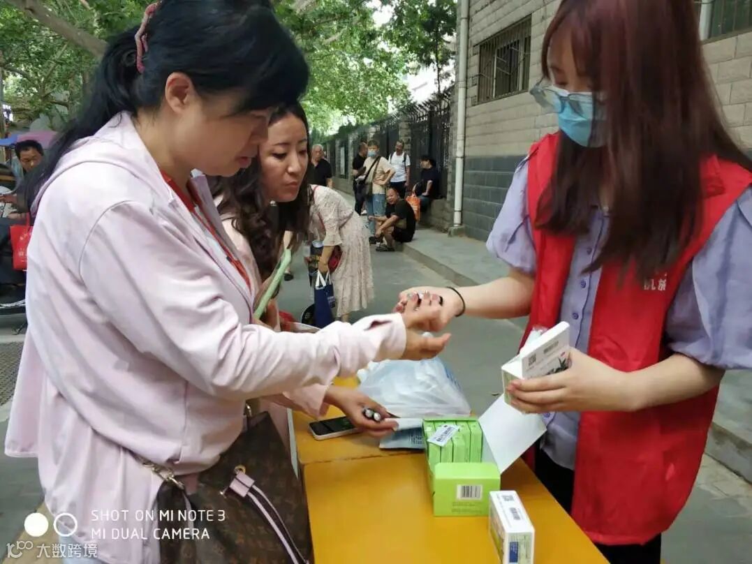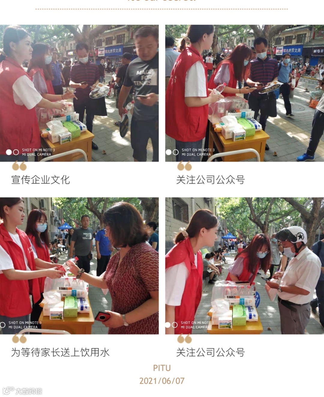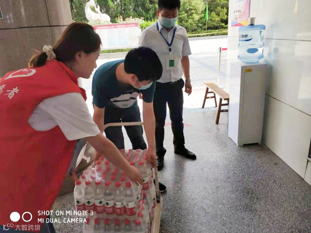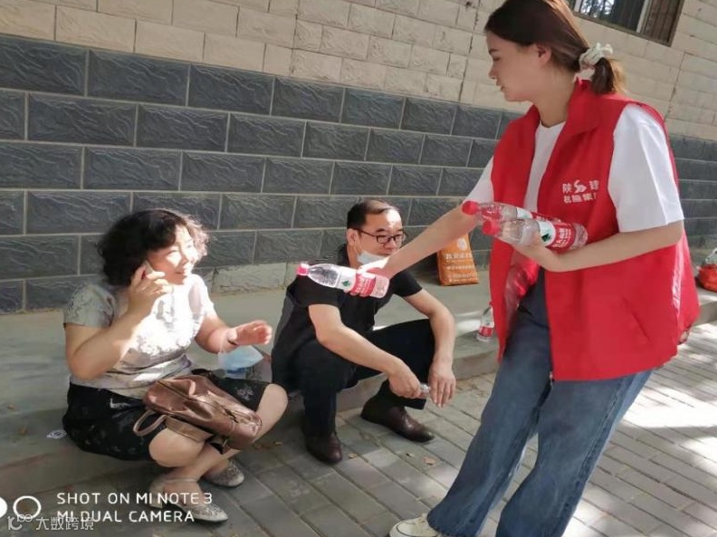 志愿服务现场,志愿者们身着红色马甲,不畏酷暑、积极热心地向考生家长们发放饮用水、湿纸巾、风油精,解暑的同时缓解焦急等待的心情。