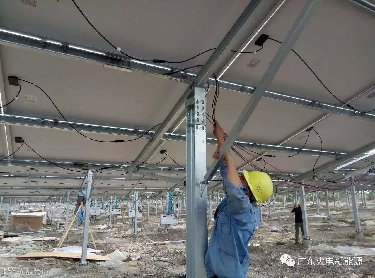 光伏项目工地施工员正在串接组件