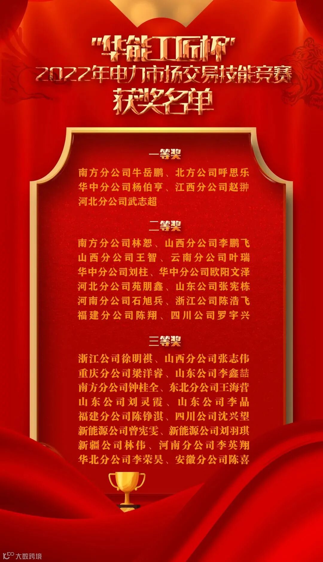 在“华能工匠杯”2022年电力市场交易技能竞赛上,南方分公司代表团收获满满,牛岳鹏同志荣获中国华能集团有限公司“华能工匠杯”2022年电力市场交易技能竞赛一等奖,被授予“华能工匠”荣誉称号;林恕、钟桂全同志分别荣获竞赛二等奖、三等奖,被授予“中国华能集团有限公司技术能手”荣誉称号。
