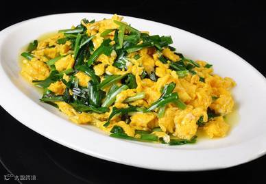 新鲜韭菜100克,洗净切碎,鸡蛋3只(去壳),同切碎之韭菜捣匀,用素油、食盐同炒至熟佐食。这样可以温中养血,温肾暖腰膝,壮阳。