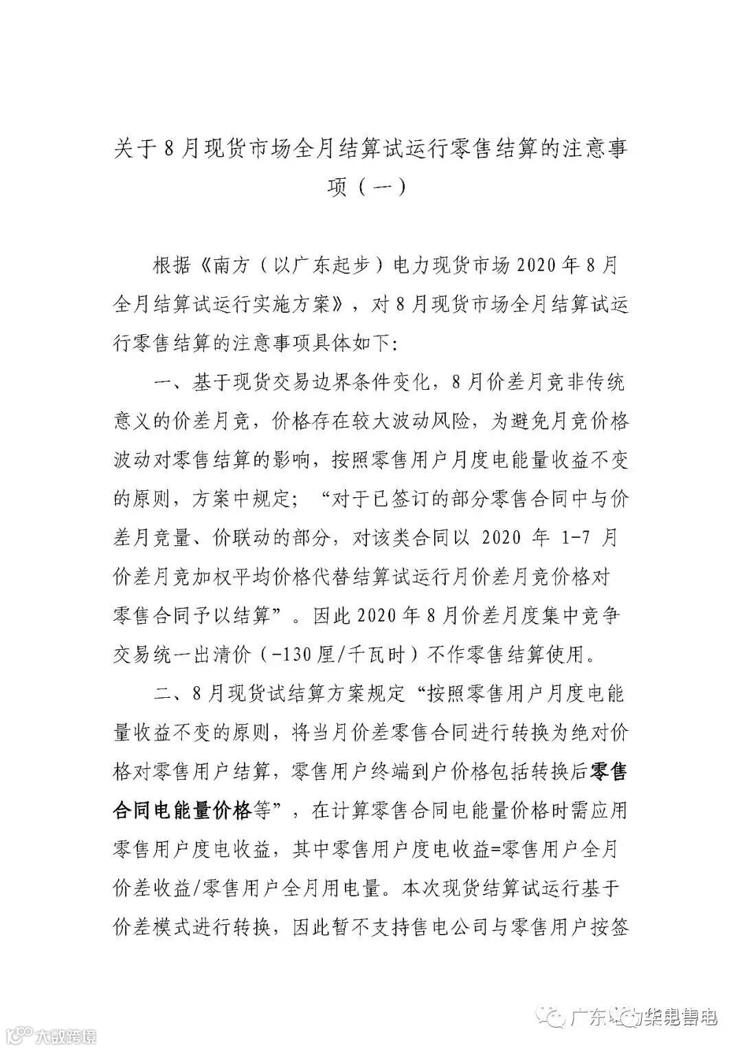 导读:根据《南方(以广东起步)电力现货市场2020年8月全月结算试运行实施方案》,对8月现货市场全月结算试运行零售结算的注意事项具体如下: