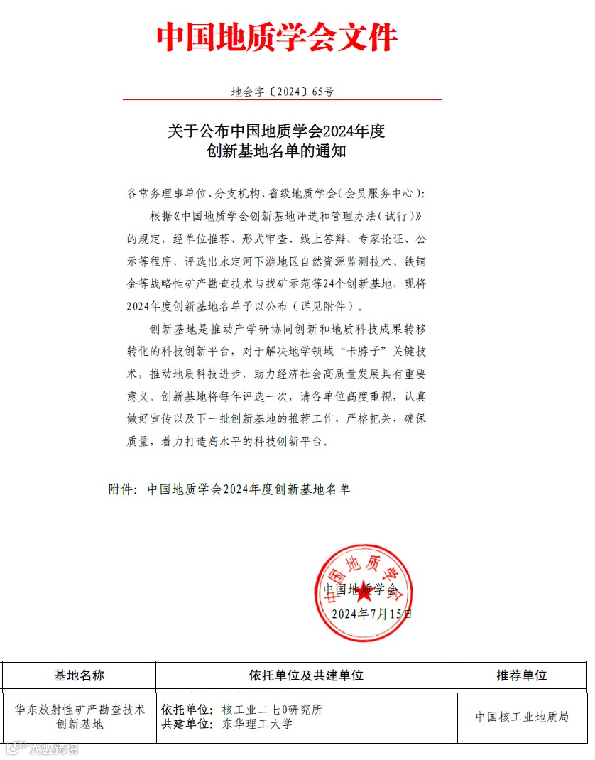 日前,中国地质学会公布2024年度中国地质学会创新基地名单,此次在全国共遴选24个创新基地。由中国核工业地质局推荐及指导,中核南方地勘中心(核工业二七0研究所)牵头申报的“华东放射性矿产勘查技术创新基地”成功获批。