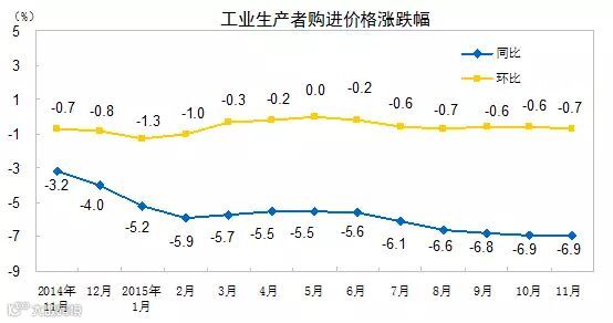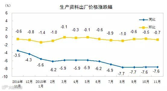 2015年11月份,全国工业生产者出厂价格环比下降0.5%,同比下降5.9%。工业生产者购进价格环比下降0.7%,同比下降6.9%。1-11月平均,工业生产者出厂价格同比下降5.2%,工业生产者购进价格同比下降6.0%。
