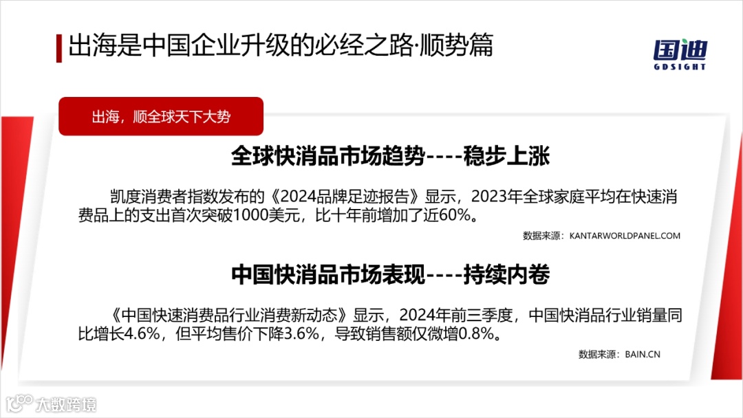 全球快消品市场保持稳健增长。根据凯度消费者指数《2024品牌足迹报告》,2023年全球家庭在快消品上的年均支出首次突破1000美元,较十年前增幅近60%。与此形成鲜明对比的是,中国本土快消品市场竞争持续加剧。 《中国快速消费品行业消费新动态》显示,2024年前三季度,尽管国内快消品销量同比增长4.6%,但平均售价下降3.6%,导致销售额仅实现0.8%的微幅增长。这一显著的全球与本土市场差异,为中国快消品企业出海开拓更广阔的增长空间创造了条件,顺应了全球市场需求扩张的宏观趋势。