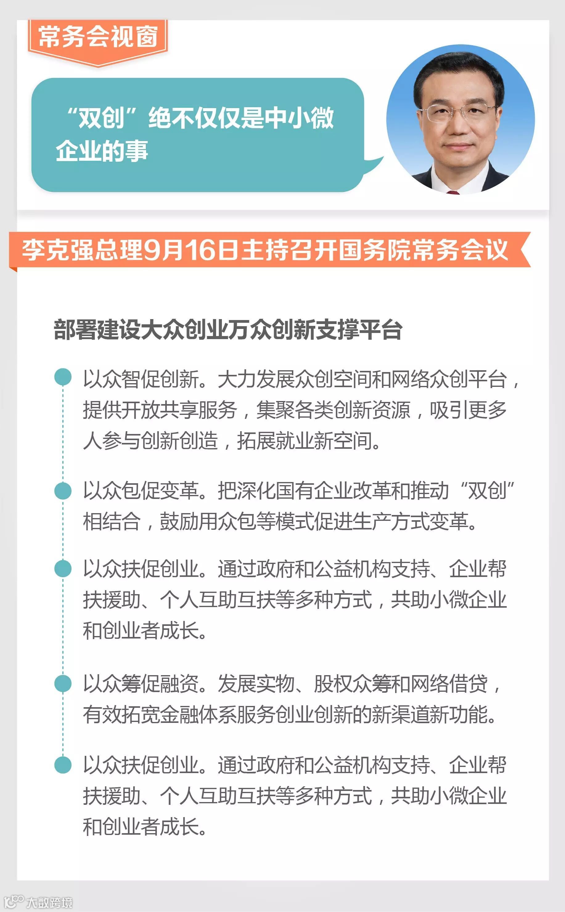 “如果说简政放权是宏观层面的改革,那么大众创业、万众创新则是一场微观层面的改革,让整个社会放开手脚、迸发活力。”总理说。他强调,“双创”绝不仅仅是中小微企业的事,大企业也要抓住互联网时代的机遇,集众智以创新推动企业发展。