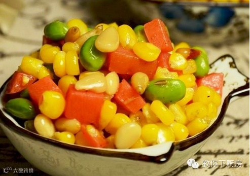 用料:糯玉米 200克、青豆 50克、胡萝卜 50克、松仁 30克、食盐 2克、白糖 5克、胡椒粉 1克、花生油 30克 1、糯玉米粒煮熟捞出备用 2、熟的青豆备用,我用的冷冻的,提前解冻,胡萝卜切成和玉米粒差不多大的丁 3、松仁放锅中小火炒熟盛出备用 4、锅中放少许油,下入胡萝卜和玉米煸炒1--2分钟,煸炒出香味 5、下入熟青豆 6、加盐、糖、胡椒粉翻炒均匀 7、最后放入松仁 8、翻炒均匀即可出锅