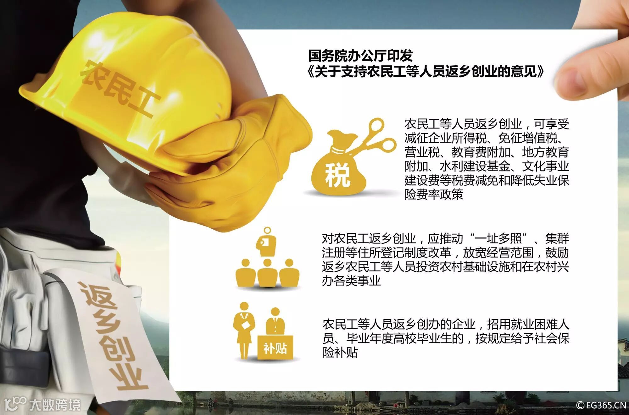 近日,国务院办公厅印发《关于支持农民工等人员返乡创业的意见》,推动农民工、大学生和退役士兵等人员返乡创业。《意见》提出了支持返乡创业的五方面政策措施,包括提升贷款金额、提供基层服务平台等,鼓励农民工通过互联网联通家乡特产与城市需求,致力于打造一批民族传统产业创业示范基地、一批县级互联网创业示范基地。
