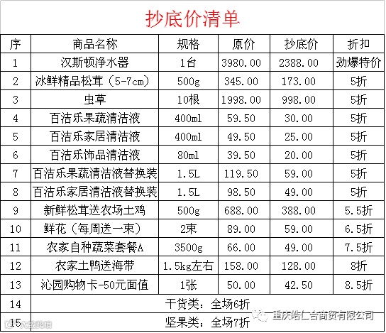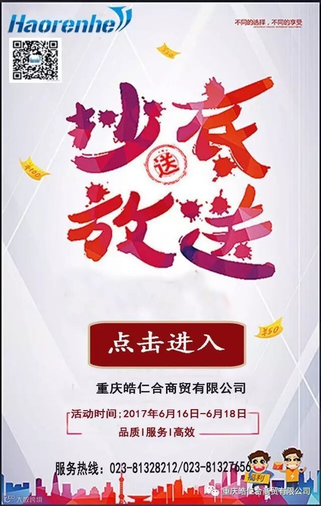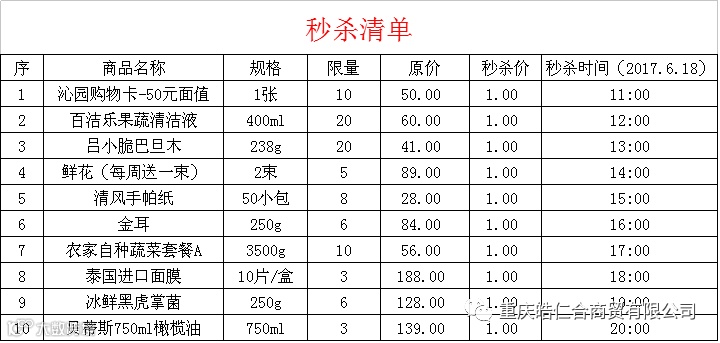 活动二:为感谢新老客户对我司的关注,2017年6月18日11:00-20:00我们将进行整点秒杀。10个单品,整点依次1元秒杀,秒杀清单如下: