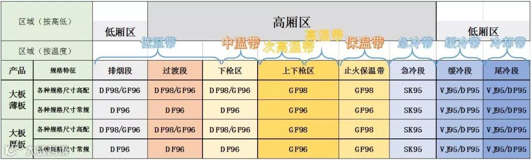 整个大板烧制过程,表现最为突出的为高温带的GF98超高温辊棒。高温抗弯和高温荷重能力让其在高温煅烧下也具有优越的负载能力,GF98φ50辊棒的承重能力相当于φ55普通辊棒。此外,GF98辊棒室温弹性模量为110GPa,是普通辊棒的1.5倍,抗变形能力更强、走砖平整度更高。在最重要的高温抗蠕变性能上,GF98的位移变化率约为1.9%,远远低于普通辊棒(4.5-6.0%)。较低的位移变化率表明GF98在高温下使用时弯曲变形非常小,能在一定程度上弱化水波纹等缺陷,为大板的平整度提供了有力的保证。
