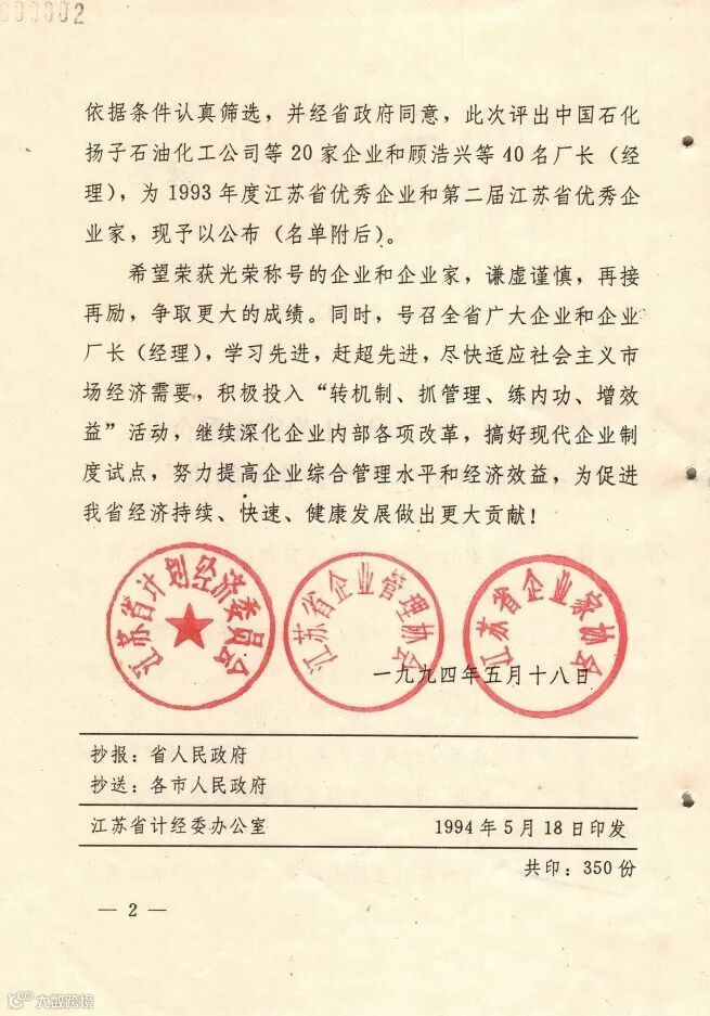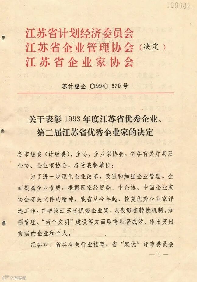 1994年5月24日,张家港市化肥厂凭借卓越的经营管理水平和显著的社会经济效益,荣膺“1993年度江苏省优秀企业”称号,该荣誉是对公司在社会主义市场经济转型初期锐意改革、创新发展的权威认证。