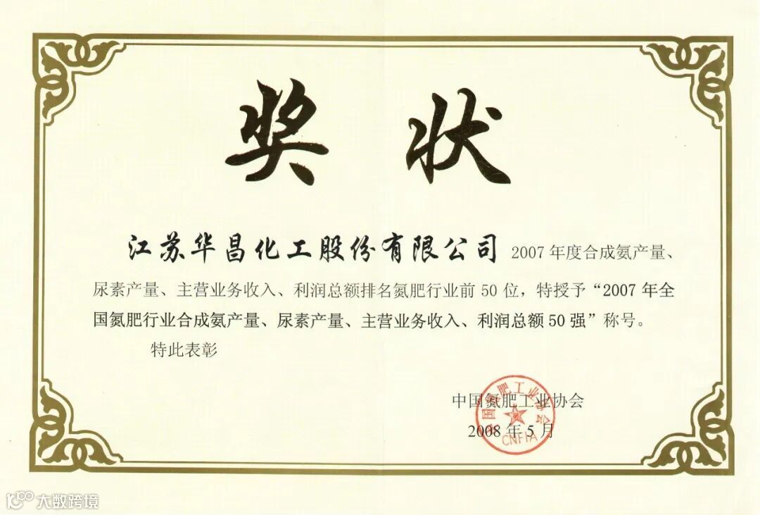 2008年5月,华昌化工被中国氮肥工业协会授予“2007年度全国氮肥行业合成氨产量、尿素产量、主营业务收入、利润总额50强”荣誉称号。