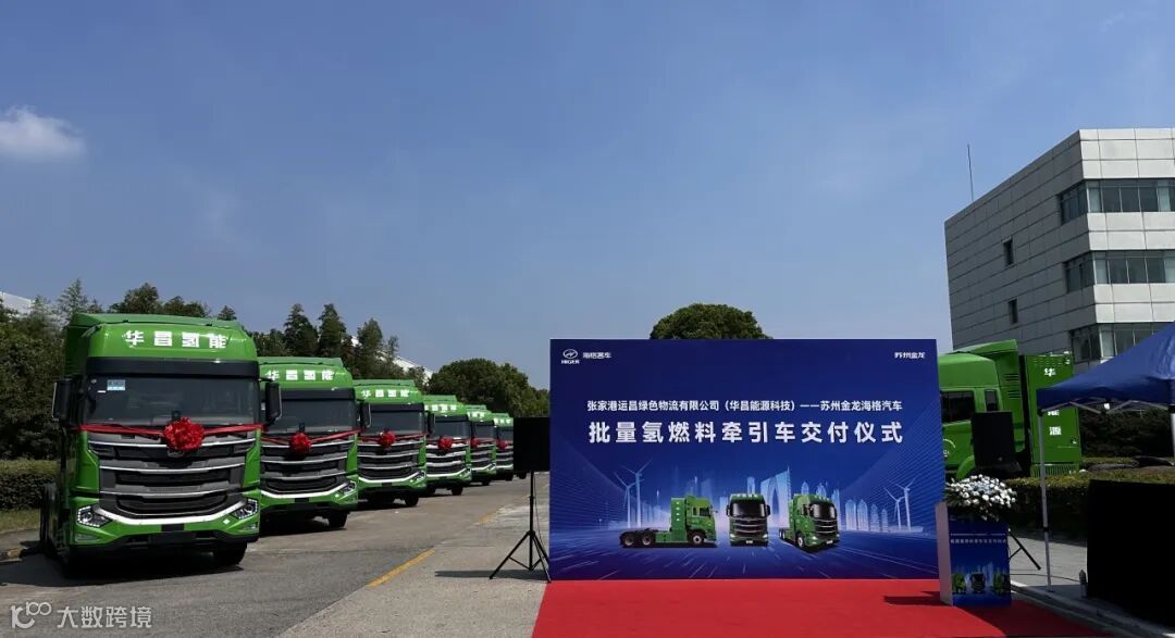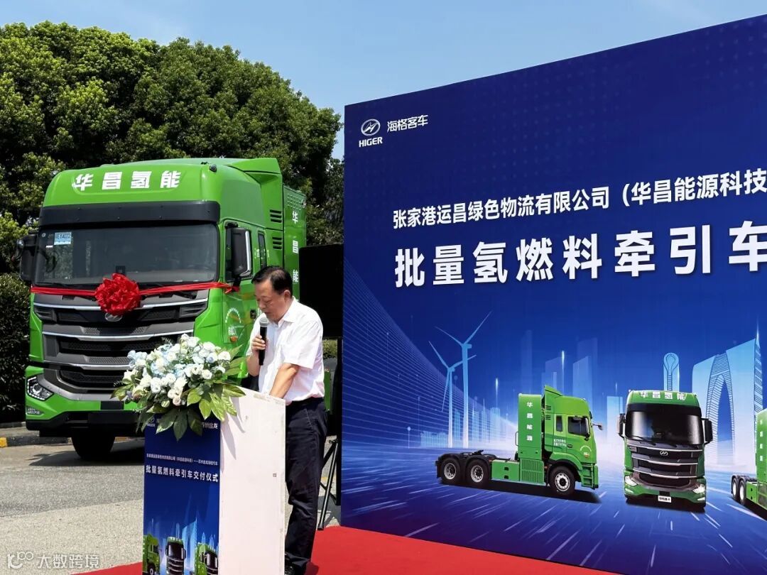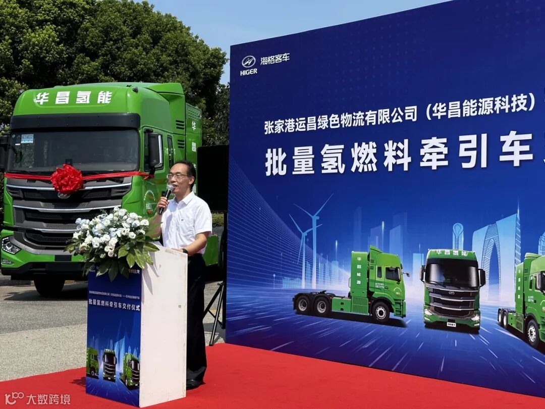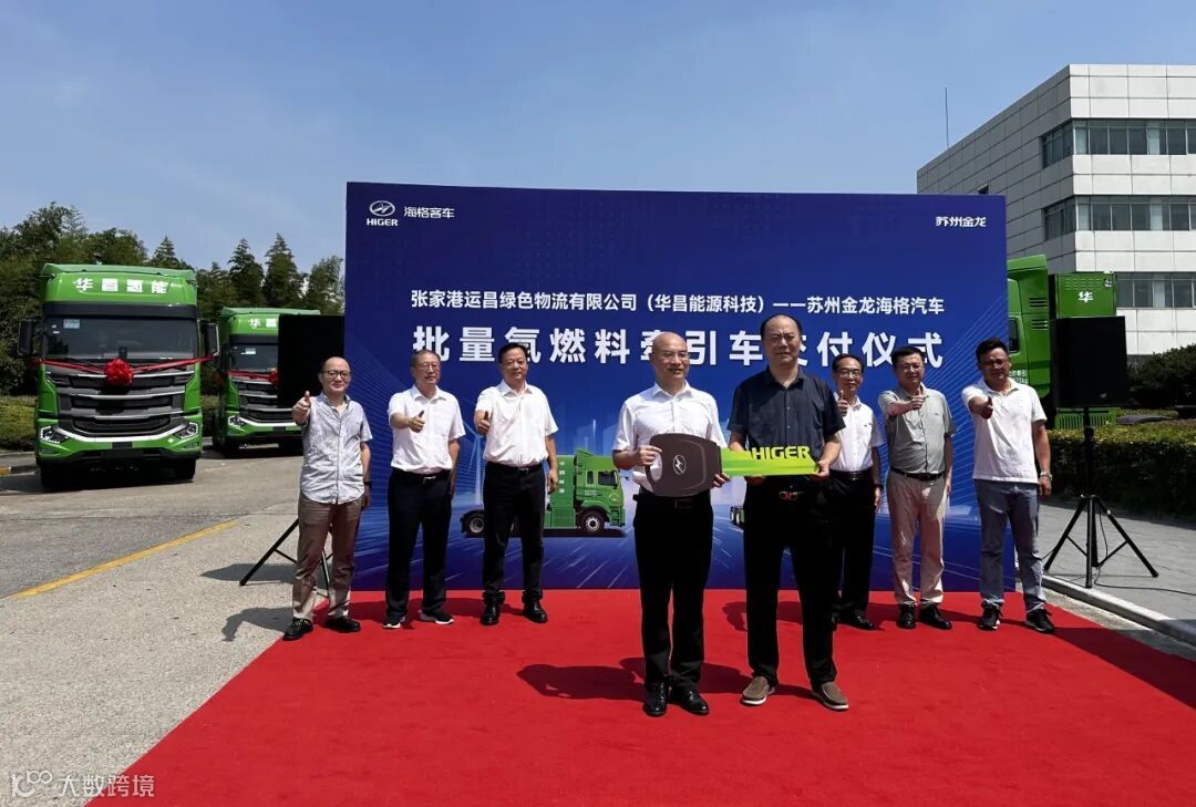 8月8日上午,由华昌能源生产的40台49吨氢燃料牵引车交付仪式在苏州金龙隆重举行。江苏华昌(集团)有限公司纪委书记陈饶忠,苏州华昌能源科技有限公司总经理徐煜,江苏港城汽车运输集团有限公司总经理赵峰,张家港运昌绿色物流有限公司总经理李奕,苏州金龙纪委书记王新亮等出席活动。