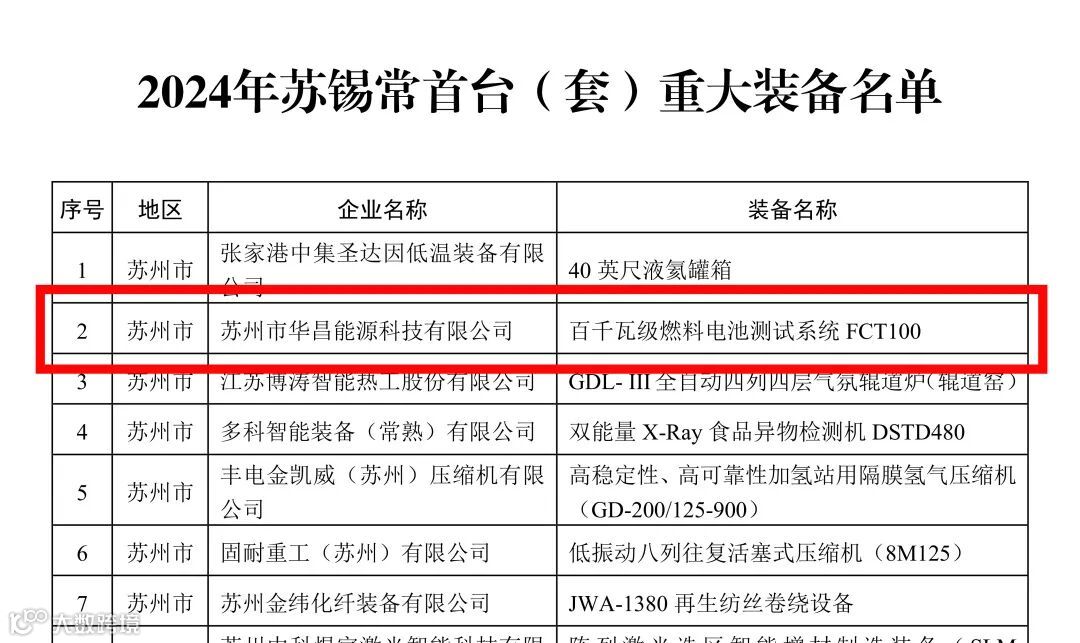 2024年苏锡常首台(套)重大装备名单正式公布,由苏州市华昌能源科技有限公司研发的百千瓦级燃料电池测试系统FCT100重大装备成功入选。