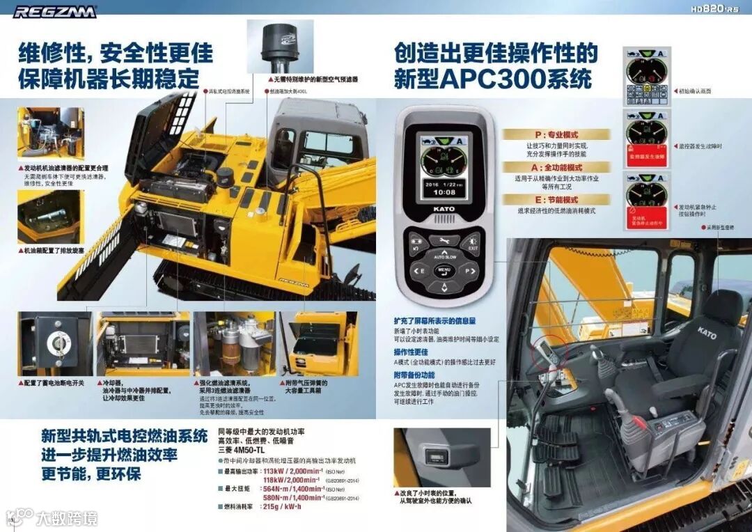 加藤HD820-R5采用的是三菱4M50TL四缸电控发动机,功率也可以达到113kw,扭矩为565 Nm,4.89L的排量以及215g/kwh燃油消耗。三菱发动机的品质相信大家都是有口皆碑的,而且在同吨位级别的挖掘机里,加藤HD820-R5拥有大大的发动机功率,效率高、低燃油、低噪音,强有力的数据;加藤HD820-R5配备了新型的APC300操作系统, 具有专业模式、全功能模式和节能模式,适用于从正常作业到大功率作业等所有工况,实现了既省油又提高了工作效率。