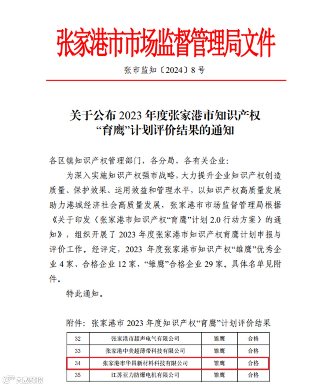 4月11日,根据张市监知(2024)8号文件通知,华昌新材料公司成功入选2023年度张家港市知识产权“育鹰”计划雏鹰企业名单,这是华昌新材料公司首次获得企业知识产权荣誉,代表了企业在科技创新领域取得的成绩获得了广泛认可。