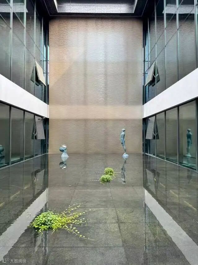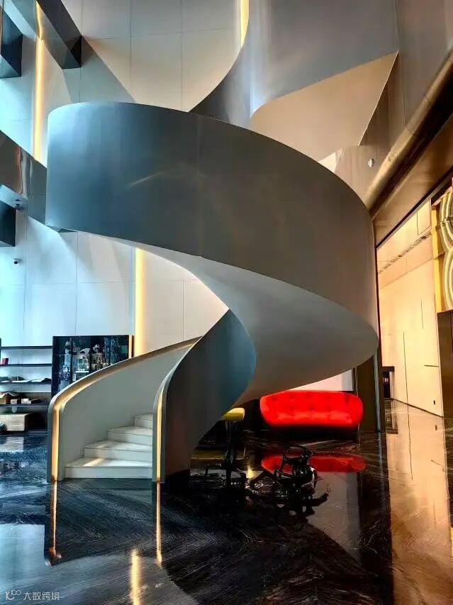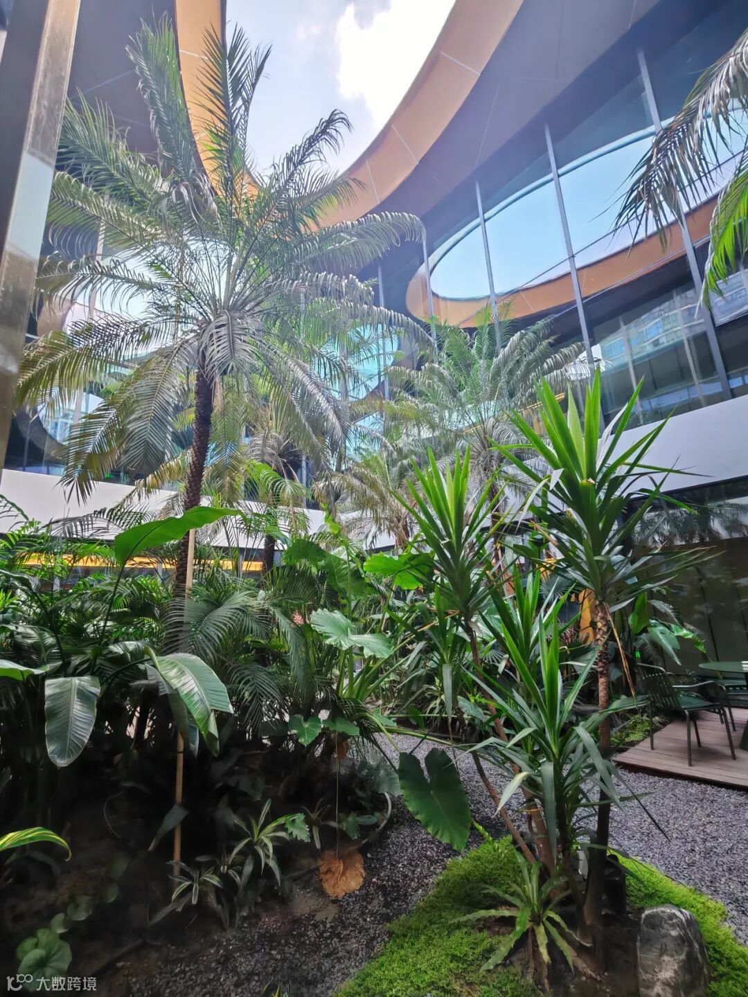 大堂旋转楼梯、镜面水景与热带绿植营造“室内雨林”