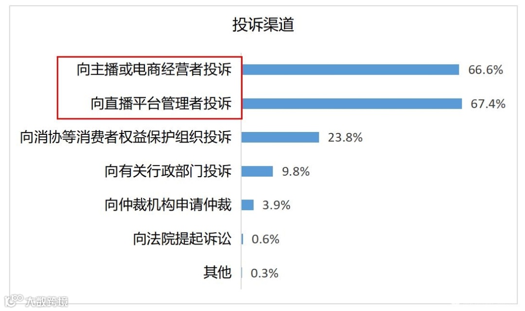 根据中国消费者协会的数据显示,从投诉渠道来看,消费者如果遇到纠纷,最普遍的做法是向直播平台管理者投诉或者向主播、经营者进行投诉;其次就是会通过向消协组织或行政部门进行投诉;还有少数也会通过司法途径寻求支持。
