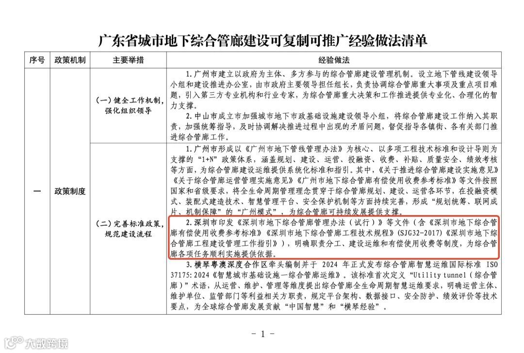 近日,广东省住房和城乡建设厅、广东省发展和改革委员会印发《广东省城市地下综合管廊建设可复制可推广经验做法清单》(以下简称《清单》),向全省推广。