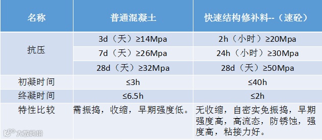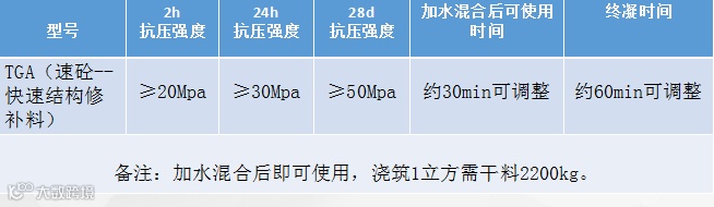快速结构修补料,是以水泥为基础结合剂,高强度材料(石英砂)作为主骨料,辅以高分子胶粉、高效减水剂、早强剂、膨胀剂、防离析等物质配制而成的超早强型混凝土结构修补材料。本产品具有自流性好,快硬、早强、高强、无收缩、微膨胀;无毒、无害、不老化、对水质及周围环境无污染,自密性好、阻锈等特点。