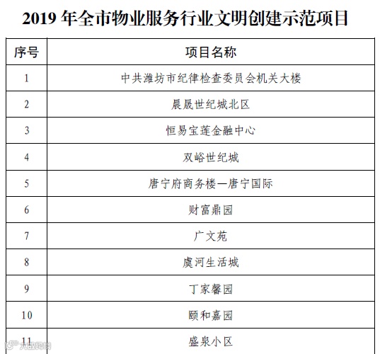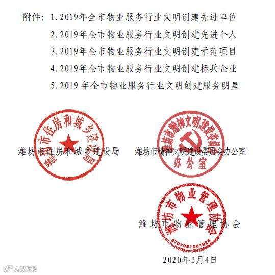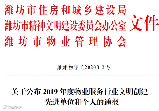 根据《关于深入开展物业服务行业文明创建标准建设年活动的通知》(潍建物字[2019]2 号)、《关于在全市物业服务行业开展文明创建活动的通知》(潍建物字﹝2017﹞1 号)等文件精神,通过自行申报、基层推荐、集体研究、公示等程序,评选出了奎文区潍州路街道办事处等先进单位50 个、、潍坊市物业管理协会孙世儒等先进个人30 名、中共潍坊市纪律检查委员会机关大楼等示范项目101 个、山东德润和风物业管理有限公司等标兵企业50 家、潍坊宏远物业管理有限公司潘霞等服务明星101 名,