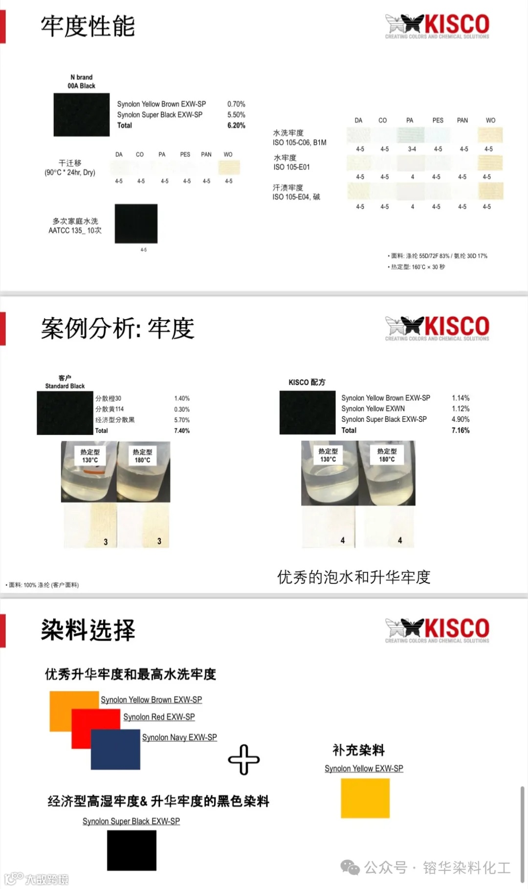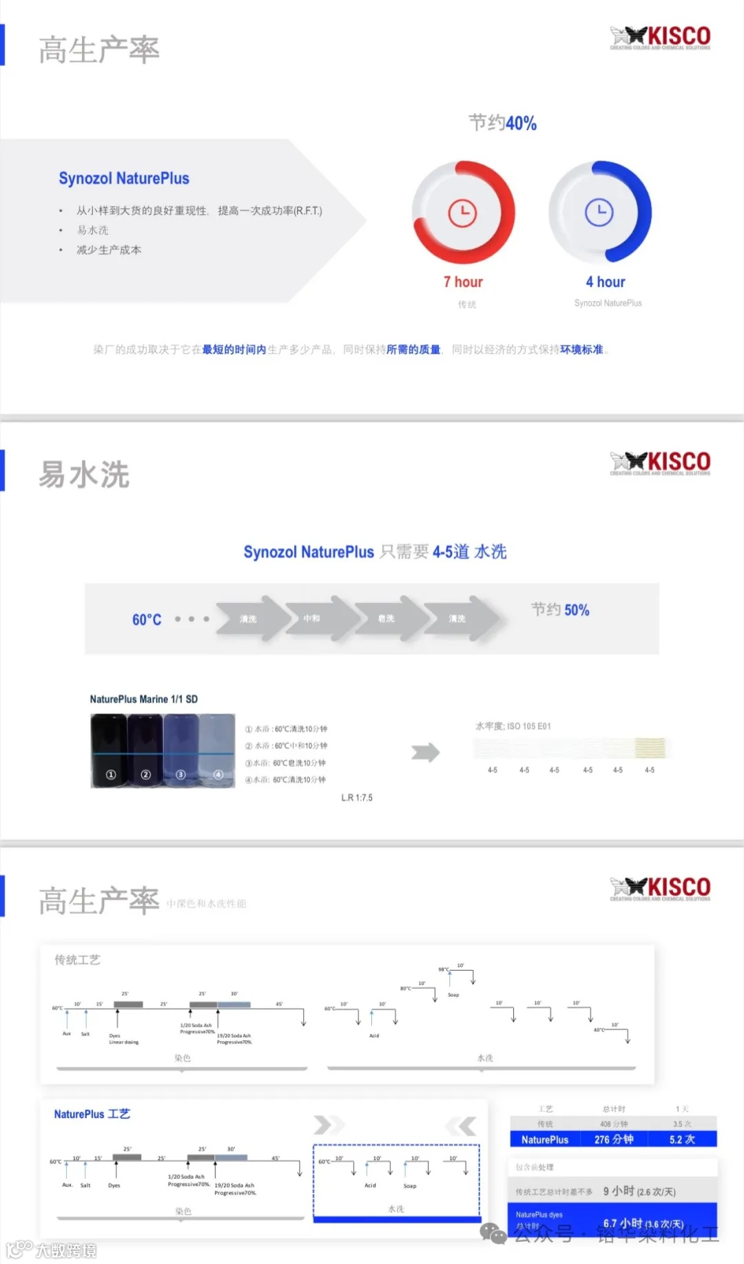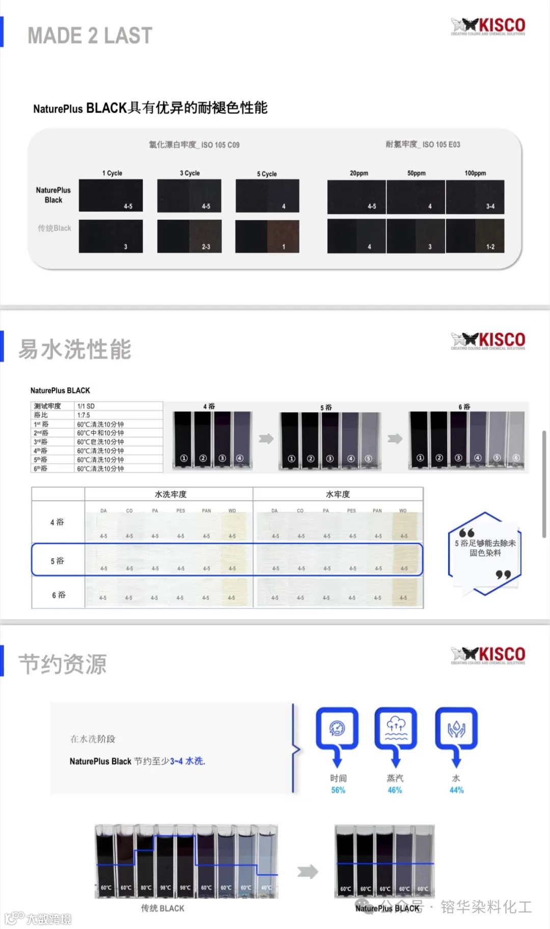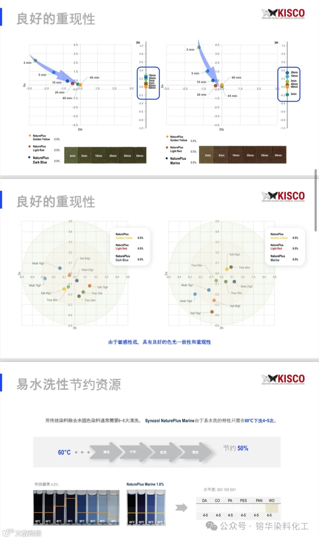 KISCO NaturePlus系列活性染料是一种突破性的产品,用KISCO NaturePlus活性染料染色的纺织品多次洗衣持久如新,并有较高的日晒、汗光牢度,良好的重现性,一次成功率高,深色易水洗,只需4-5缸水,节能、节水、节时,综合能耗减少40%。