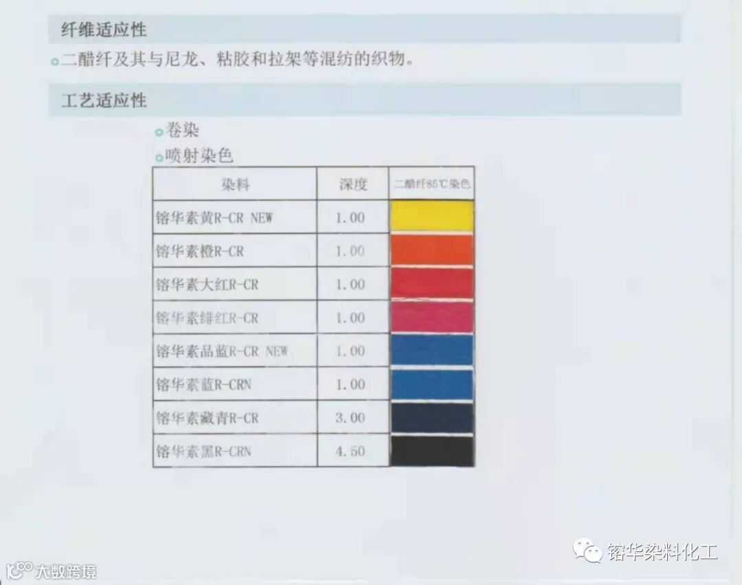 2、在醋酸纤维上可获得比以往更高的湿牢度。