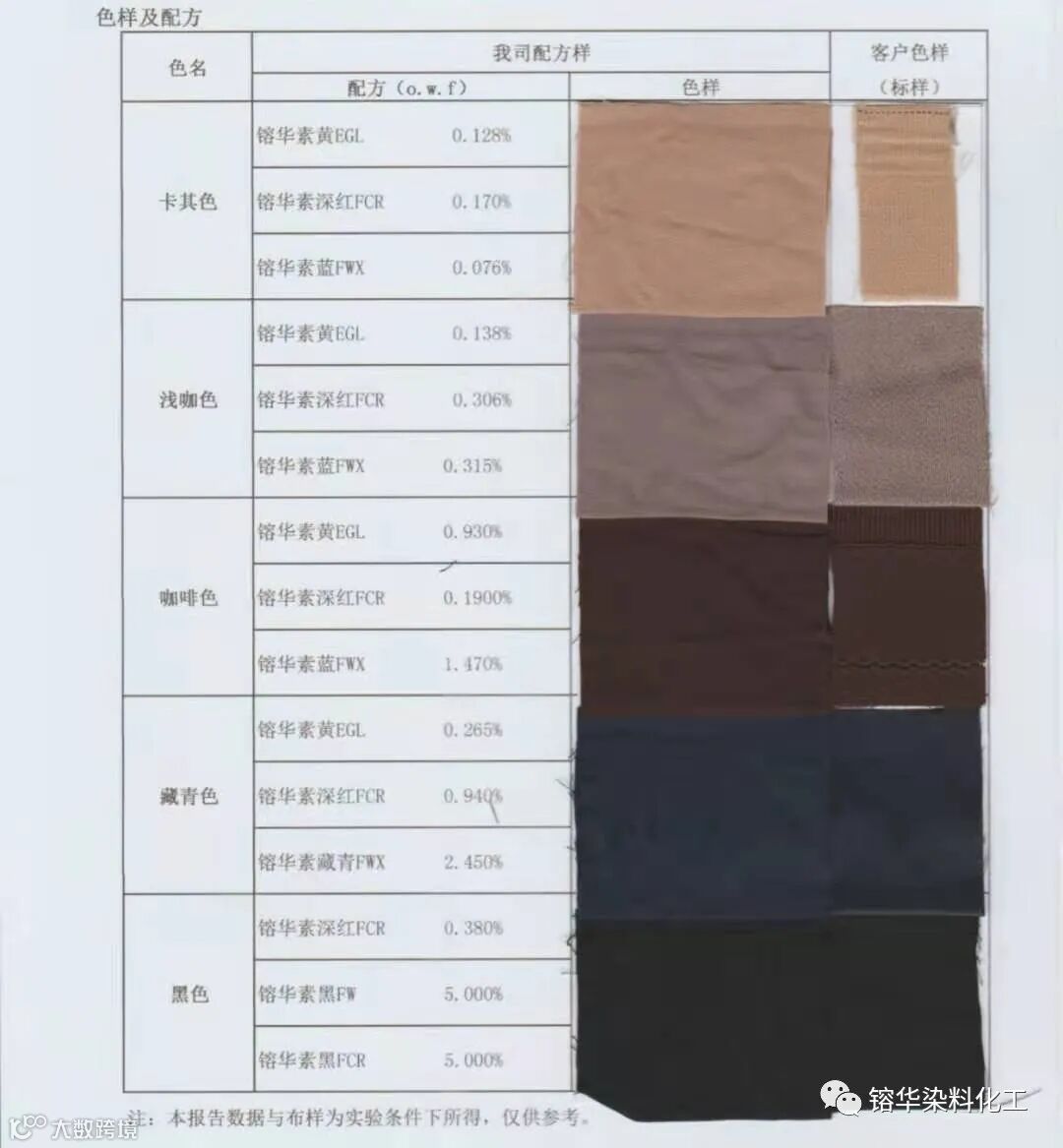 卡其色、咖啡色、浅咖色、藏青色和黑色,选择染料在客供织供织物上仿色打样。