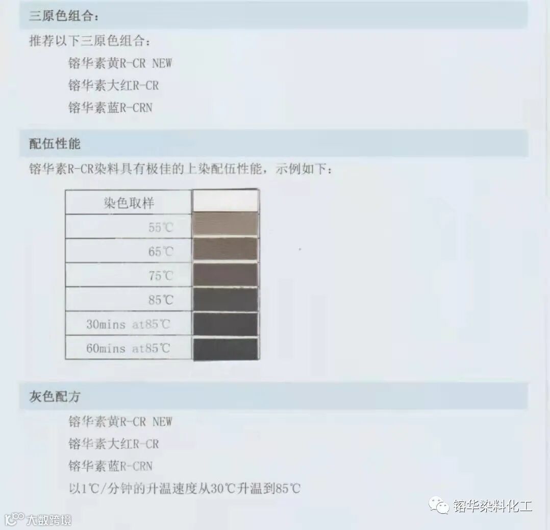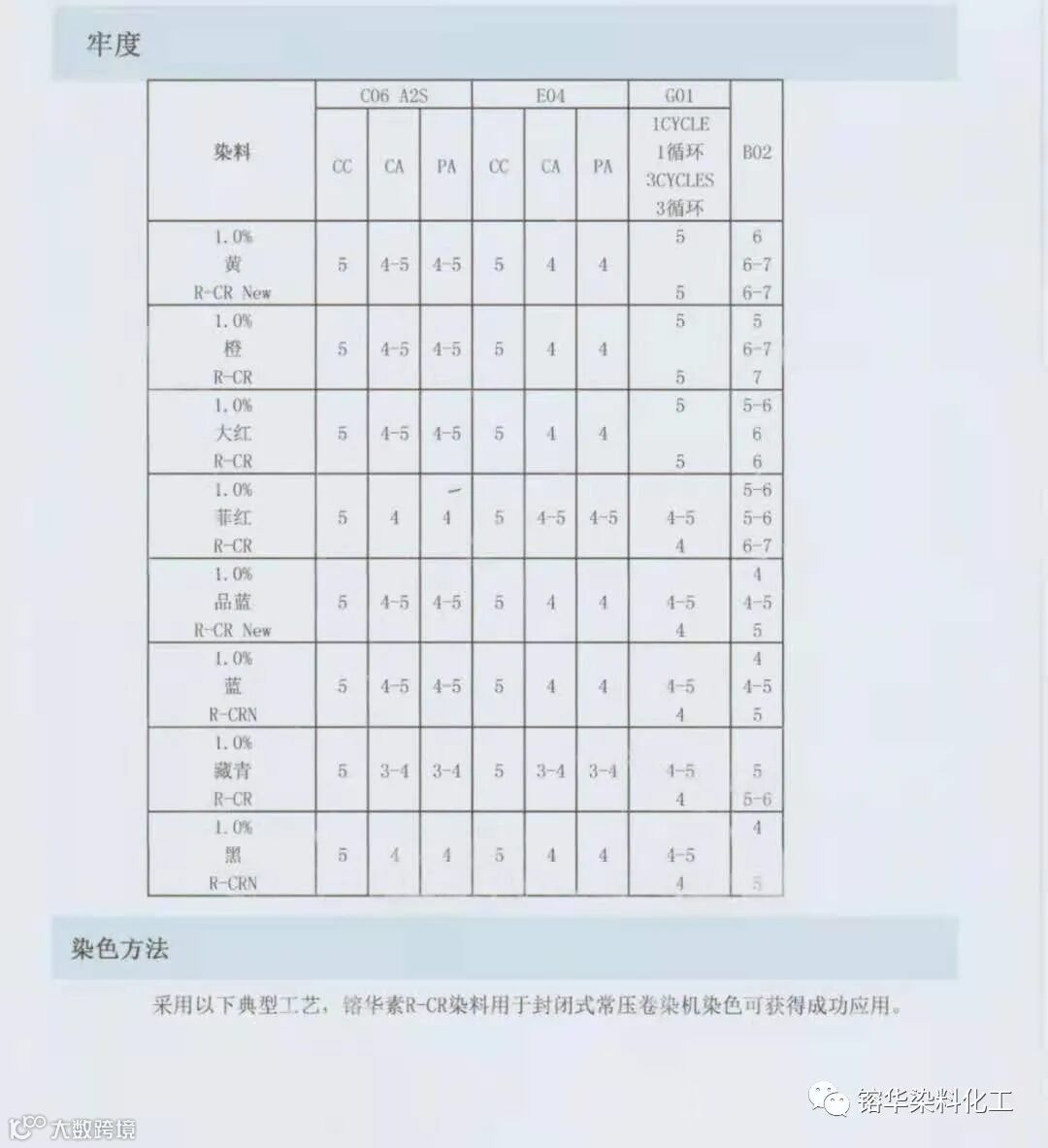 5、在正常使用条件下,用镕华素R-CR染料染二醋/三醋纤维可以满足0eko-Tex标准100的要求。