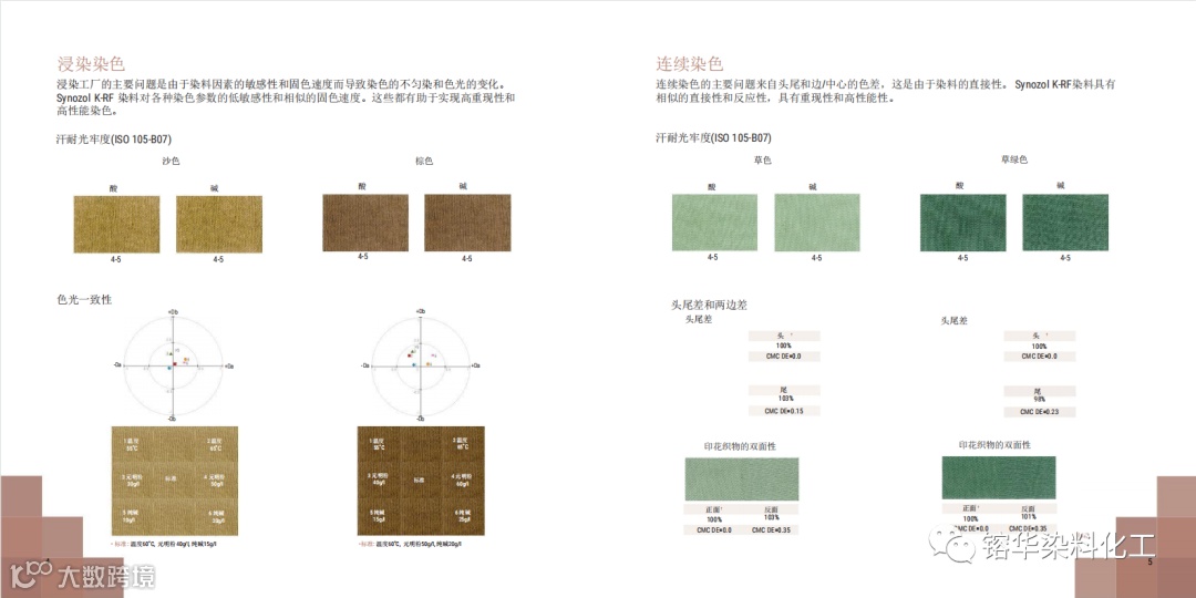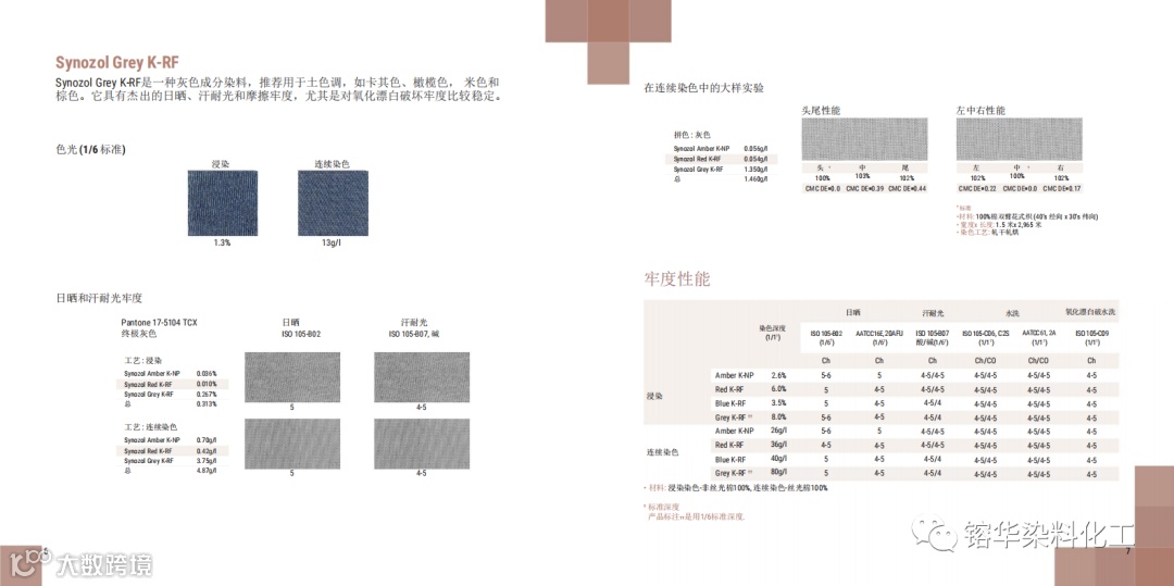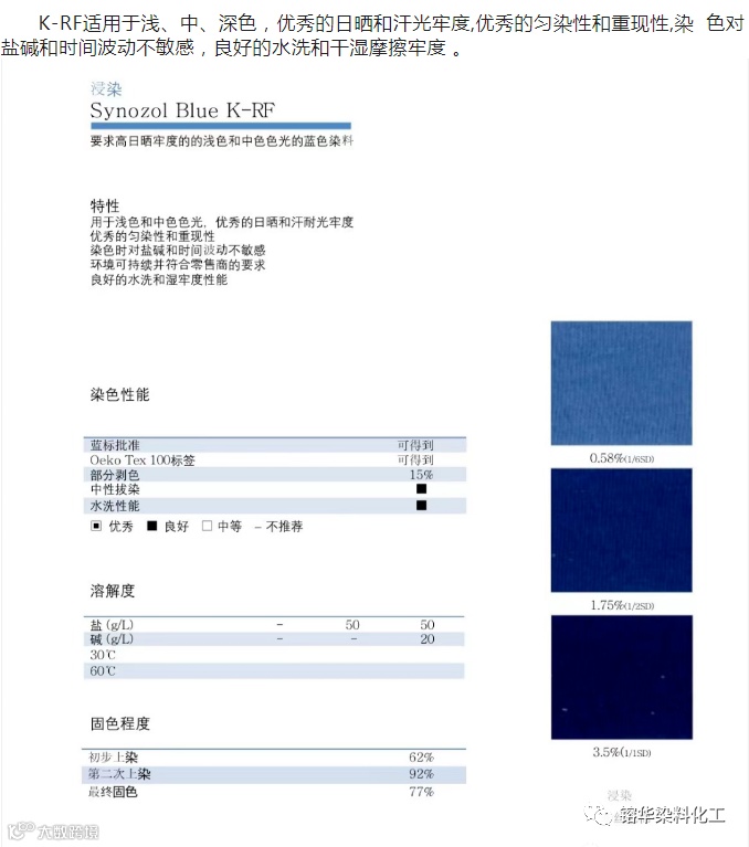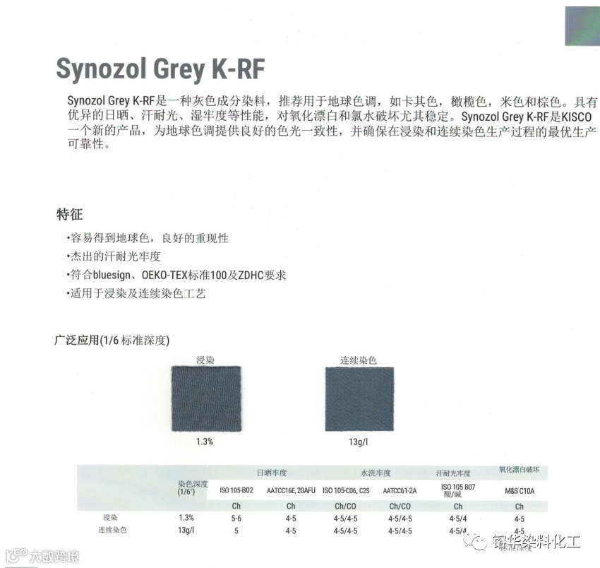 导读:K-RF具有优异的日晒、耐汗光、湿牢度等性能,对氧化漂白和氯水破坏尤其稳定。K-RF是KISCO一个新的产品,为地球色调提供良好的色光一致性,并确保在浸染和连续染色生产过程中的最优生产可靠性。