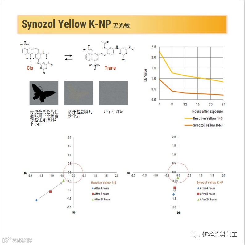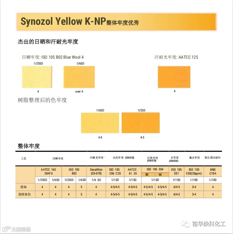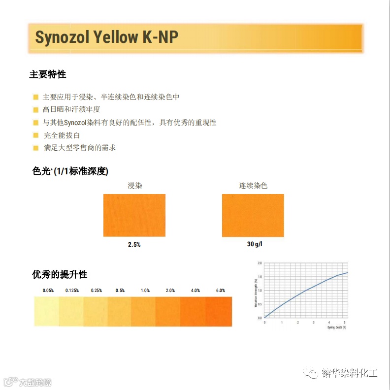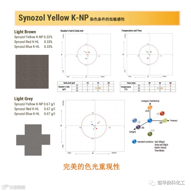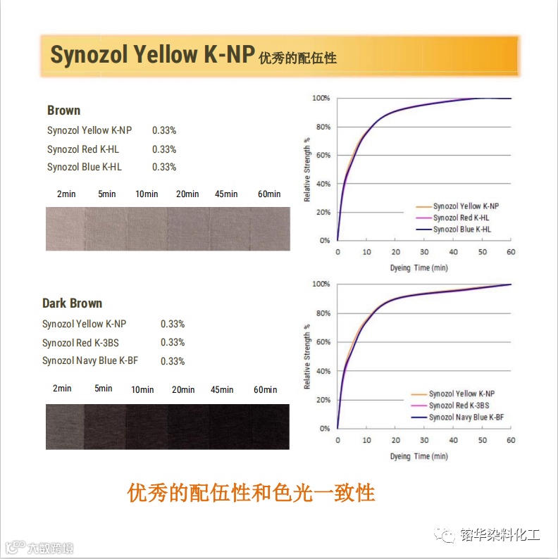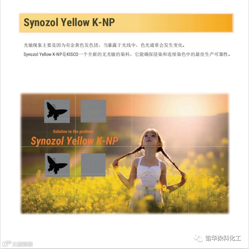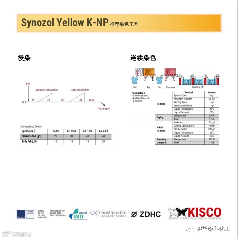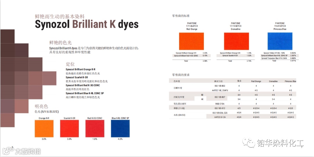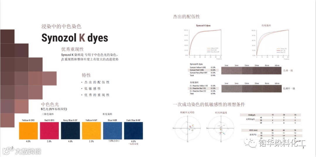 Synozol K 染料是活性染料的一个新系列,经过改进的化学结构使其具有更独特的性能。三原色组合有优秀的配伍性,能得到更明亮的色光。