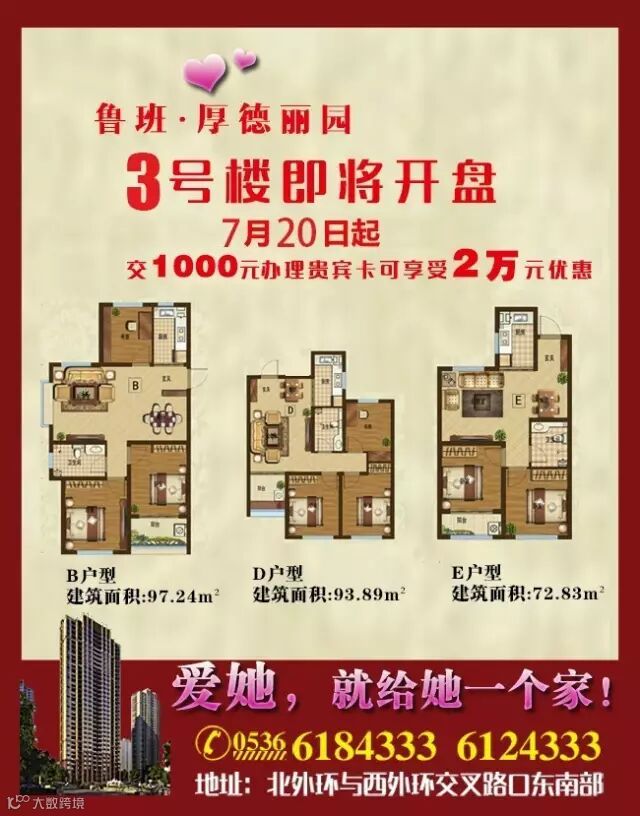 鲁班·厚德丽园初心未变,为诸城人打造买得起,还得起,住得起的好房子!无需遗憾,3#楼价格同样实惠,户型始终优秀,位置更加便捷!感兴趣的朋友欢迎拨打下方售楼热线或至售楼处咨询。