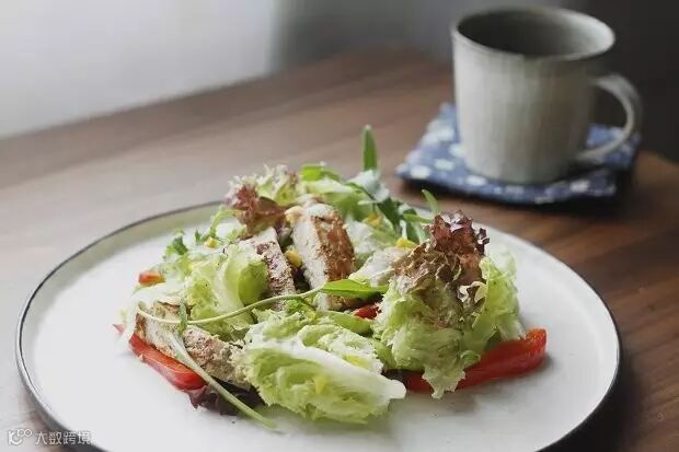 3、拿出另一个碗,垫上洗干净的生菜叶,倒扣伴好的沙拉,就行啦!