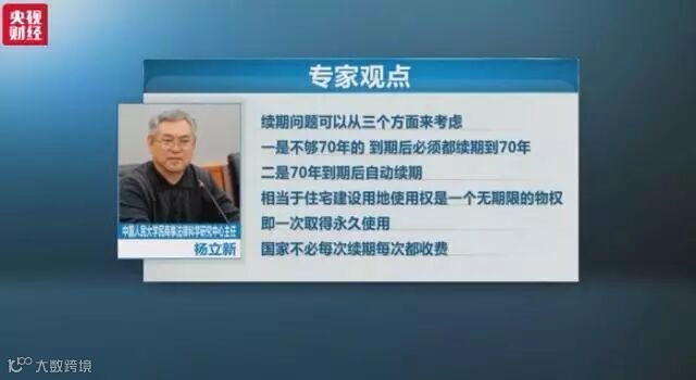 中国人民大学民商事法律科学研究中心主任 杨立新:续期问题可以从三个方面来考虑,一是不够70年的, 到期后必须都续期到70年;二是70年到期后自动续期,相当于住宅建设用地使用权是一个无期限的物权,即一次取得永久使用,国家不必每次续期每次都收费;三是到期后经过自动续期变成永久性建设用地使用权之后,应当确定使用权人与国家所有权人之间的关系,可以考虑收取必要而不过高的税金,但应当经过立法机关立法决定。