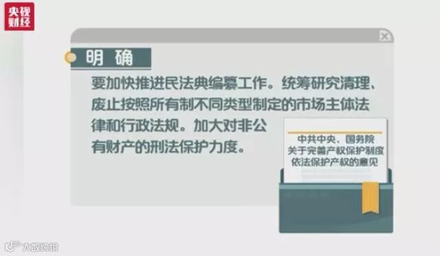 《意见》明确要加快推进民法典编纂工作。统筹研究清理、废止按照所有制不同类型制定的市场主体法律和行政法规。加大对非公有财产的刑法保护力度。