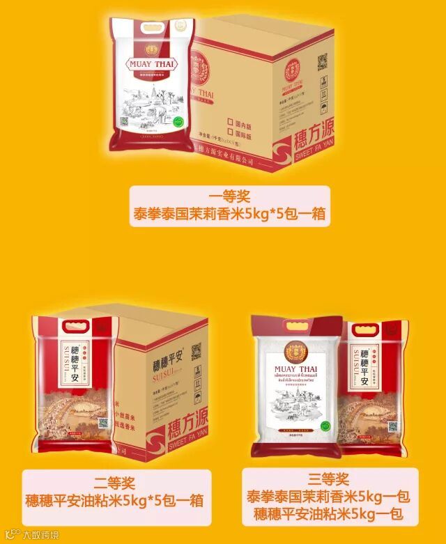可获得总价值139.8元的泰拳5kg一包和穗穗平安油粘米5kg一包。