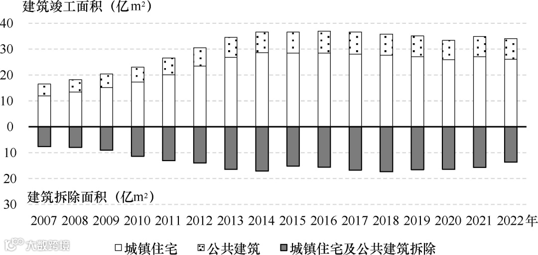 我国城镇建筑竣工量和拆除量(2007-2022年)