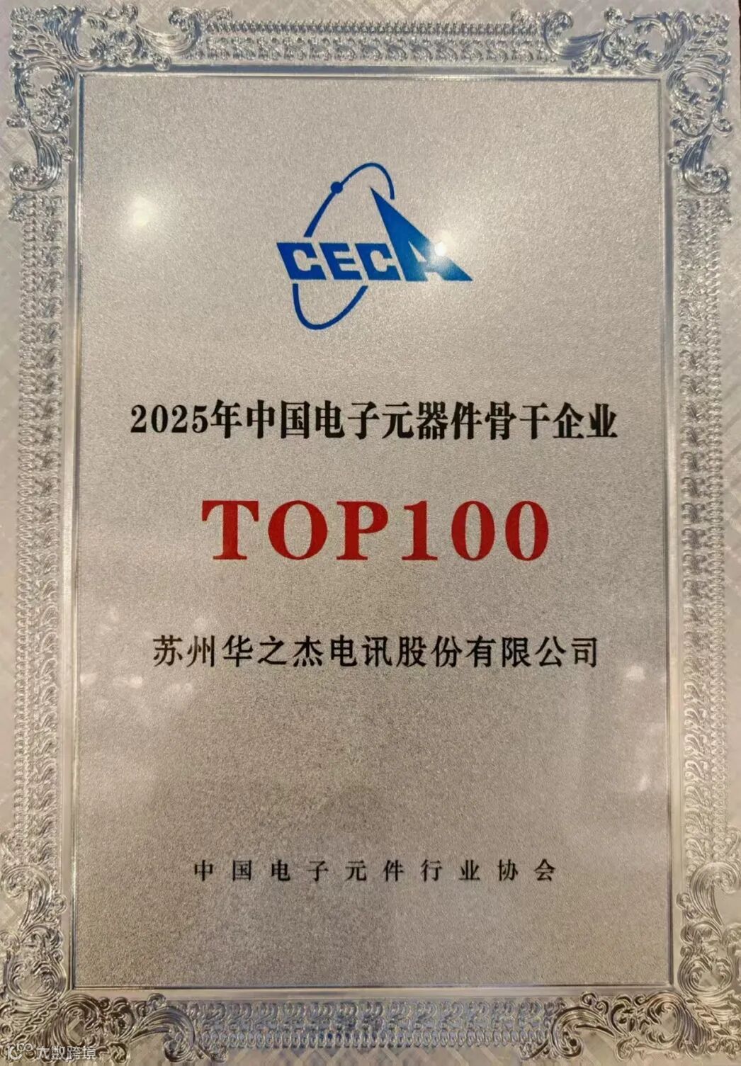 2025年8月28日,由中电元协主办的中国电子元件行业协会第九届第三次理事会暨2025中国电子元件产业峰会在苏州同里古镇盛大开幕。在会中举行的2025年中国电子元器件行业骨干企业授牌仪式上,华之杰荣获“2025年中国电子元器件骨干企业TOP100”荣誉。