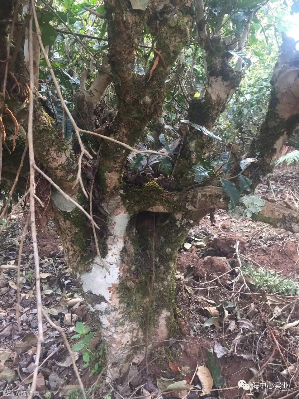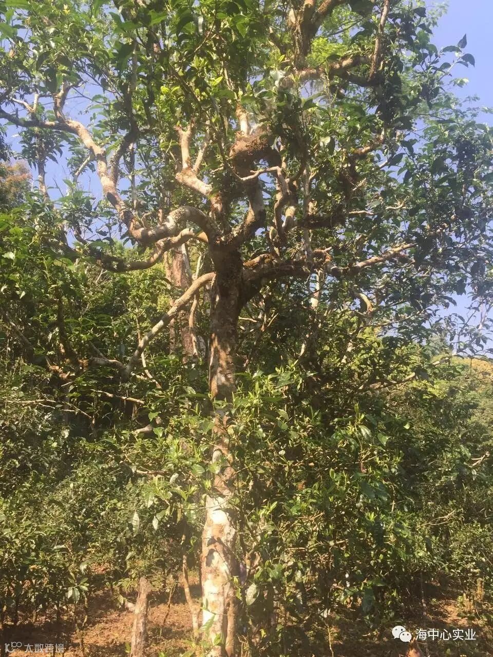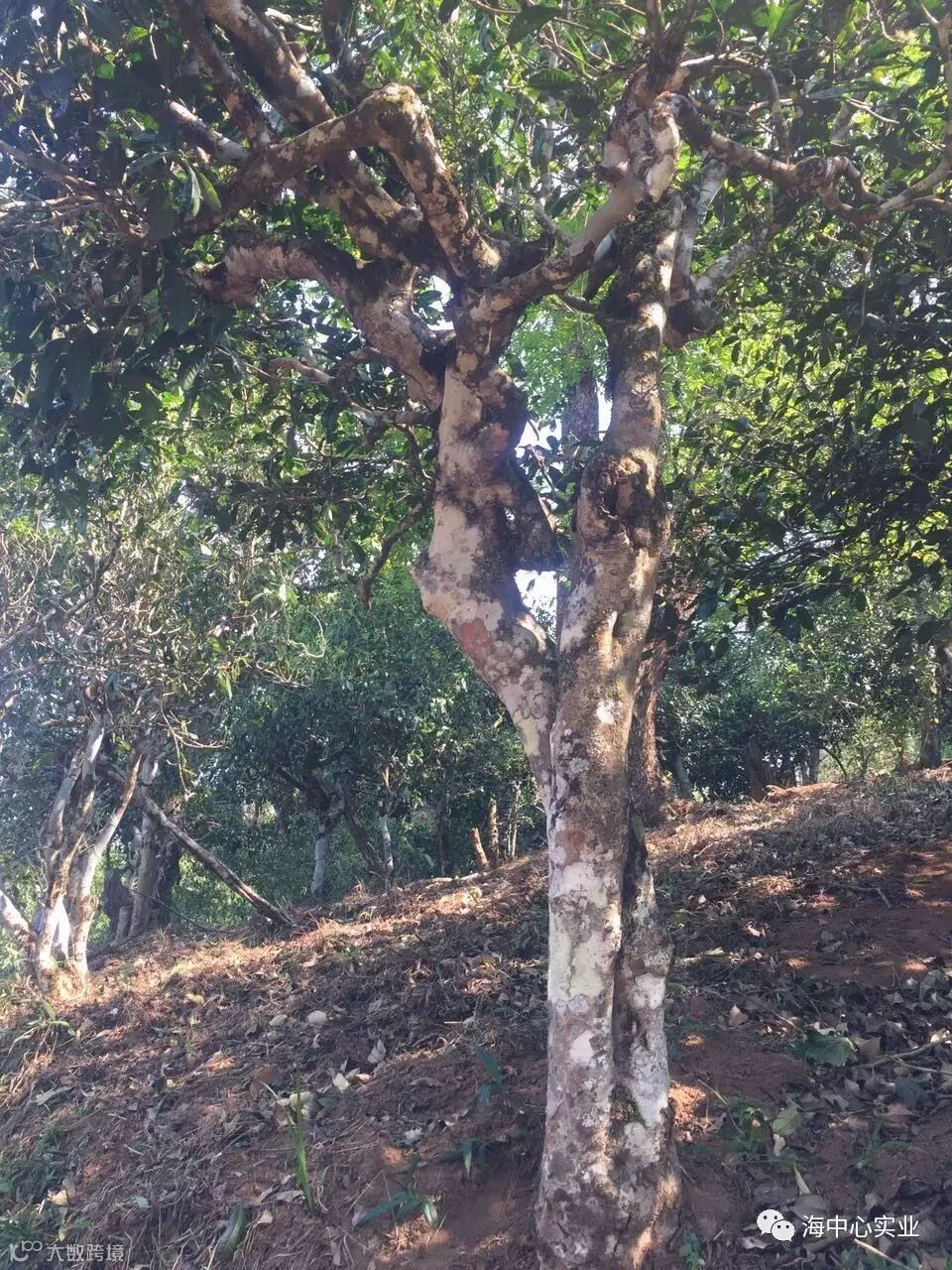 这里茶树也是经过矮化的茶园,树干粗细茶距较大,但是他们说这都是同样树龄的。