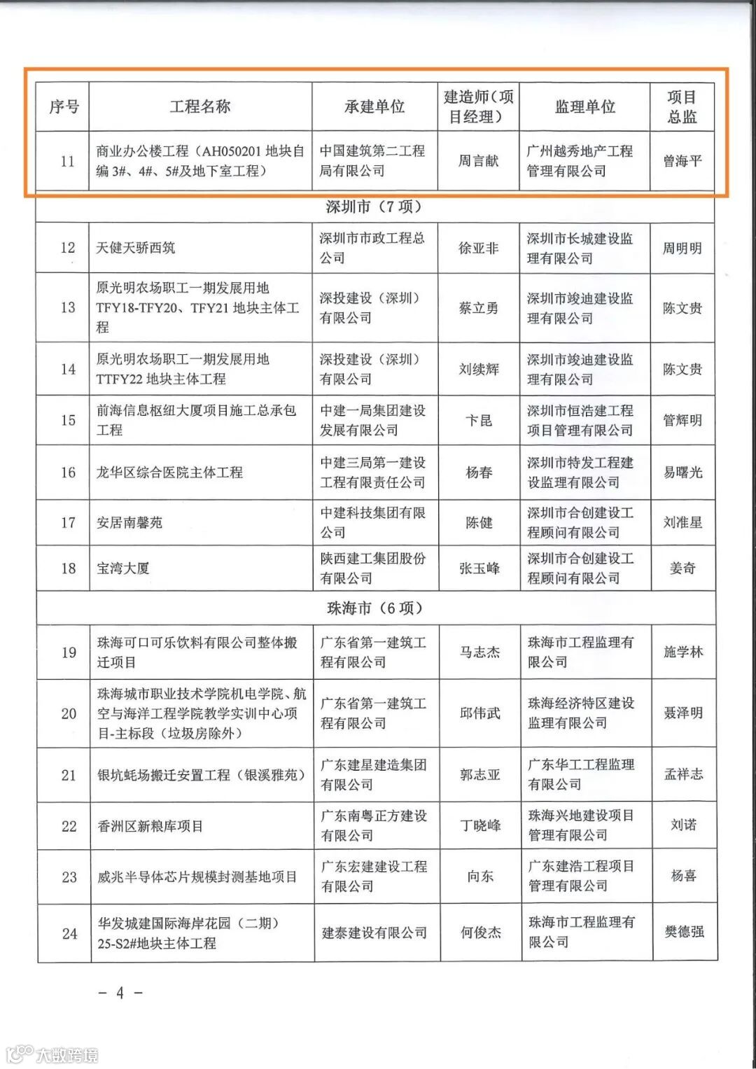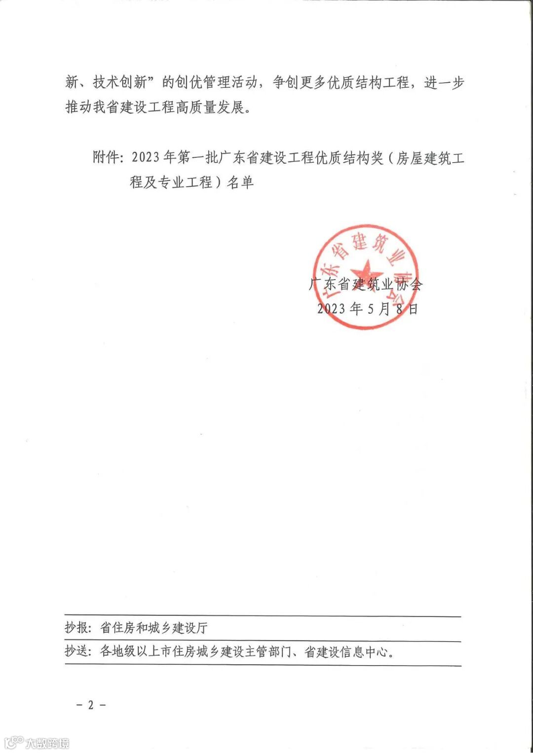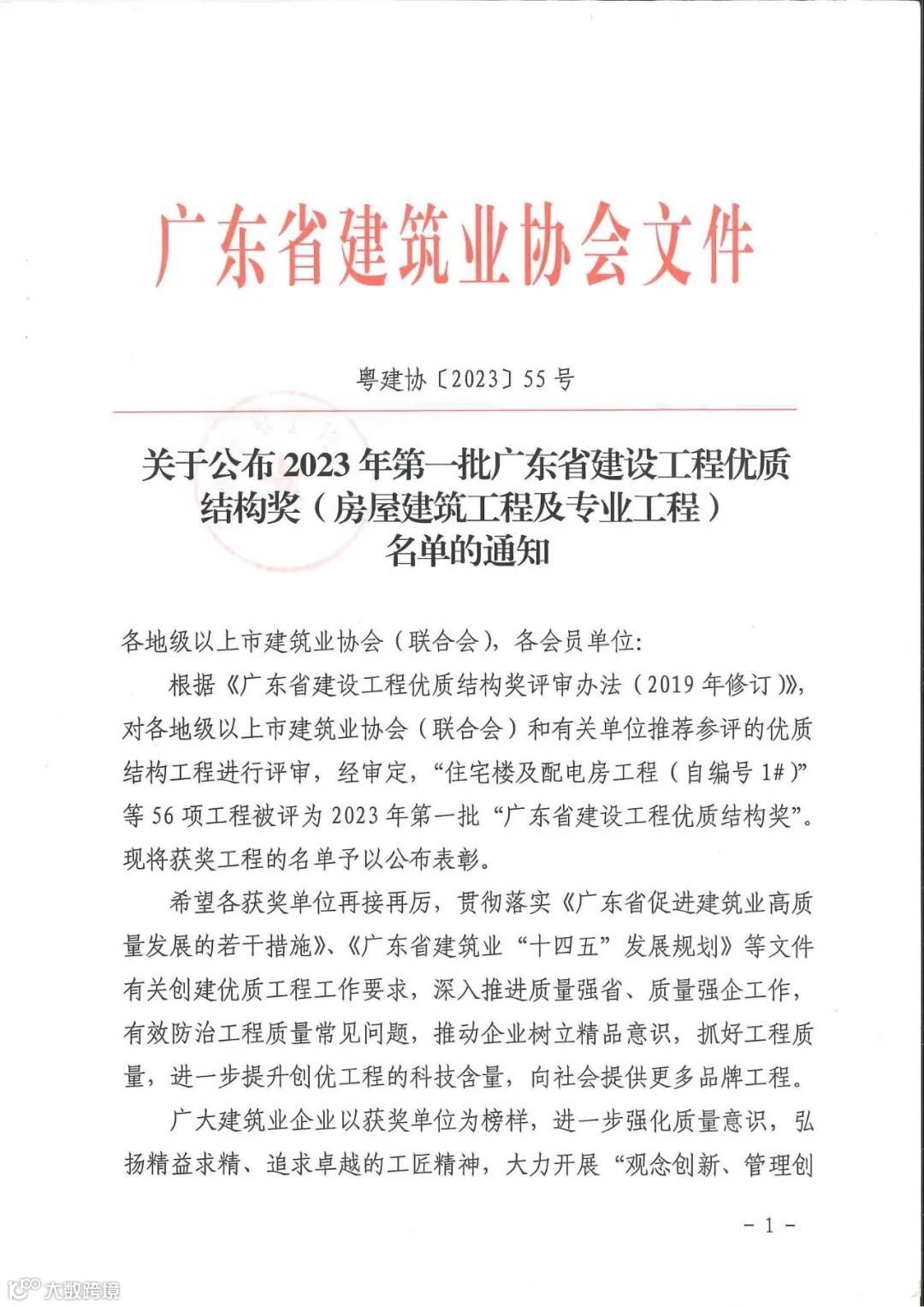 根据《广东省建设工程优质结构奖评审办法(2019年修订)》对各地级以上市建筑业协会(联合会)和有关单位推荐参评的优质结构工程进行评审,经审定,我司监管的商业办公楼工程(AH050201地块自编3#、4#、5#及地下室工程)评为2023年第一批“广东省建设工程优质结构奖”。