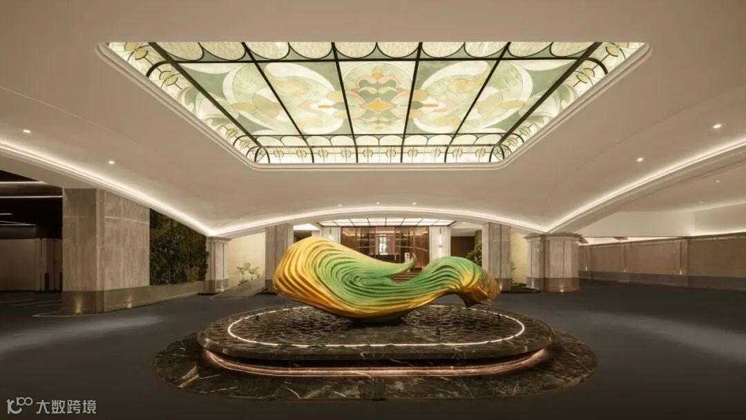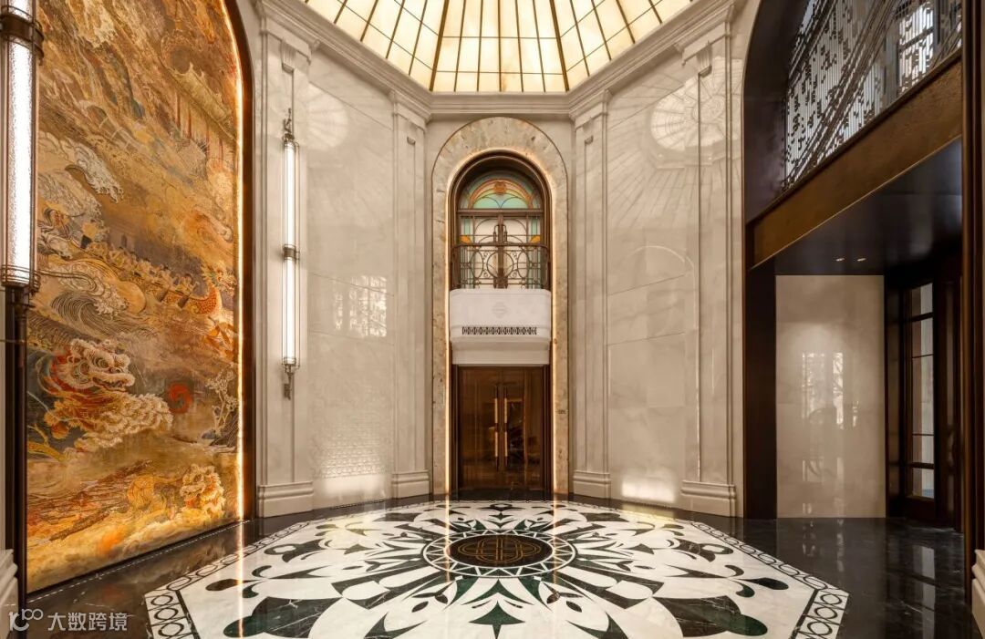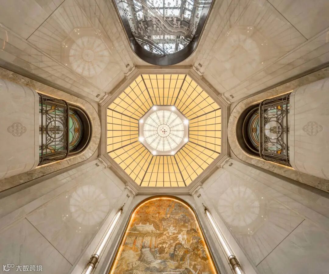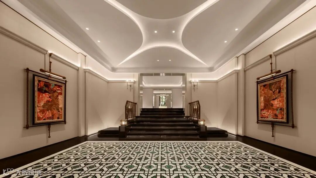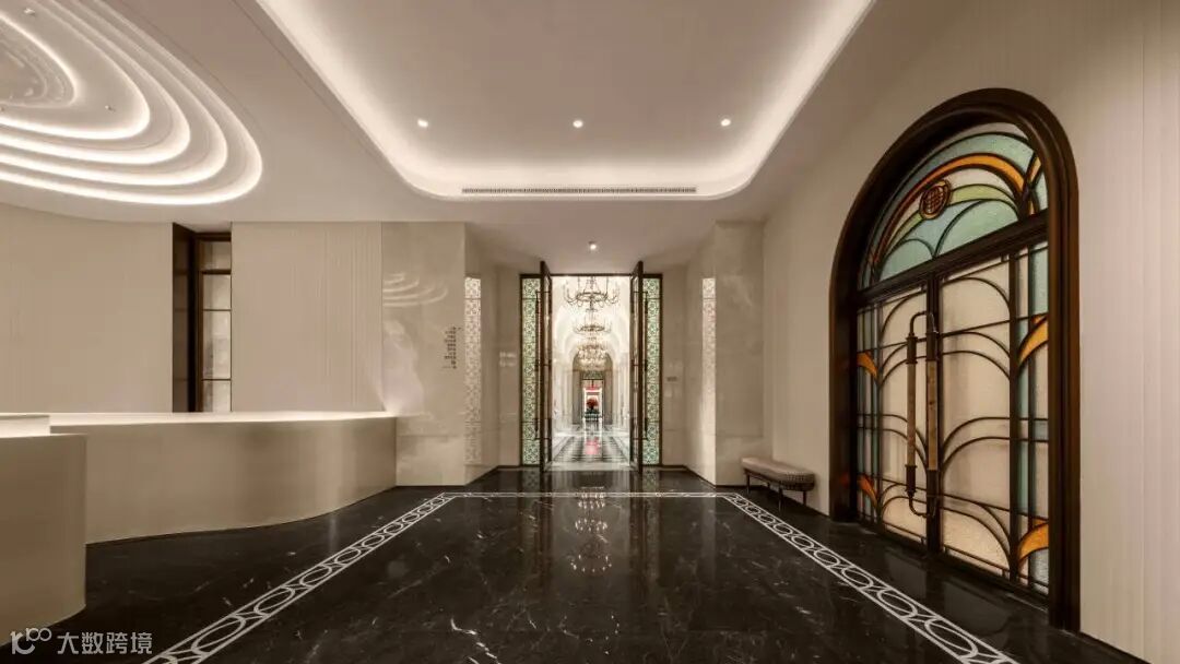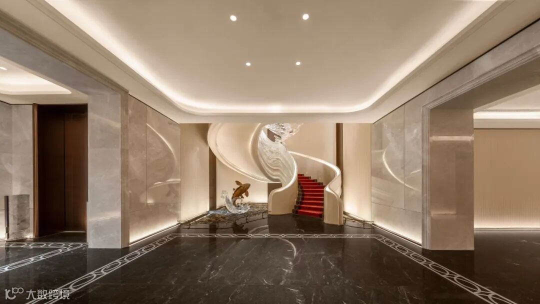 入园大堂采取挑高中空的结构,八角形玻璃穹顶引入天光,与墙面浅色石材形成柔和辉映;地面黑白拼花大理石如静水铺陈,延伸出秩序与稳定感;巨型挂画运用非遗工艺凝练出“云水禅”精神内核,关于龙舟竞渡、醒狮腾跃、祖庙飞檐的壁画中的文化意象,悄然唤醒归属,鱼跃龙门”旋转楼梯成为空间中最动人的艺术焦点——鲤尾跃浪、鳞光闪烁,寓意步步高升。