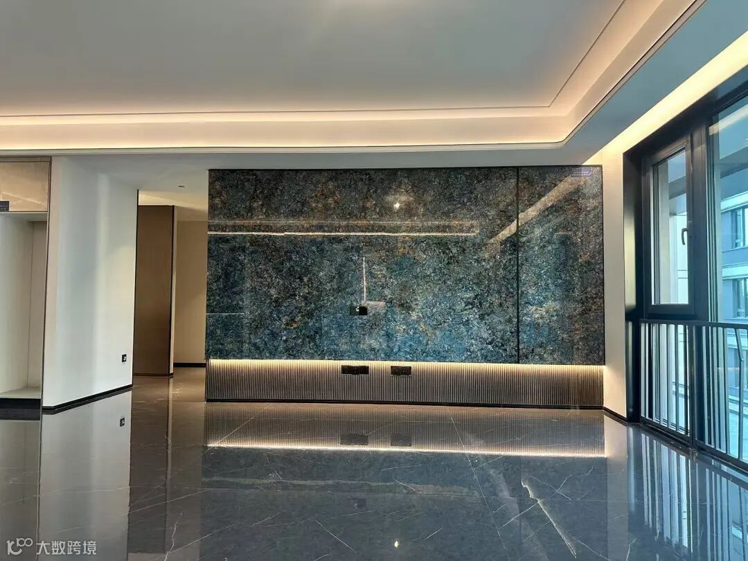 项目采用新中式设计,客厅背景墙以高档宝石蓝岩板为点缀,搭配米白色皮质硬包及黑褐色不锈钢元素,实现功能与美学深度融合。